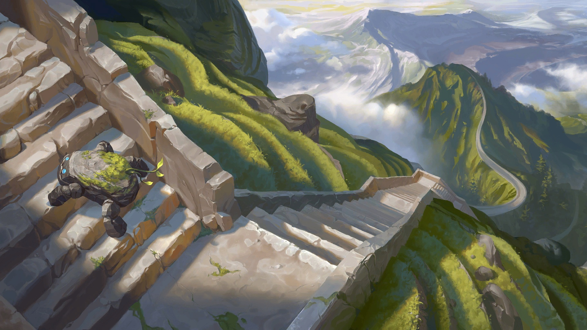 Description: A painting of a man climbing a mountain with a backpack on his back and a backpack on his shoulder.