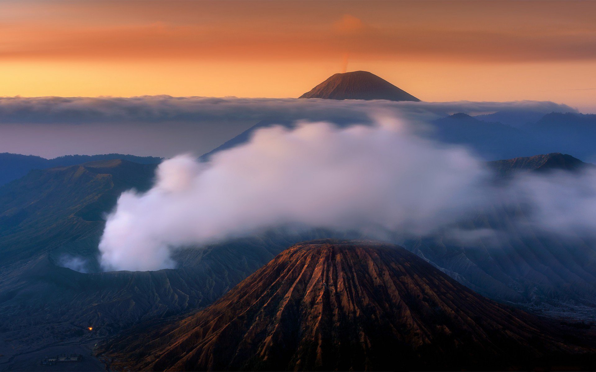 Description: A mountain with a cloud covering it and a mountain in the distance with a sunset in the background and a few clouds in the foreground.