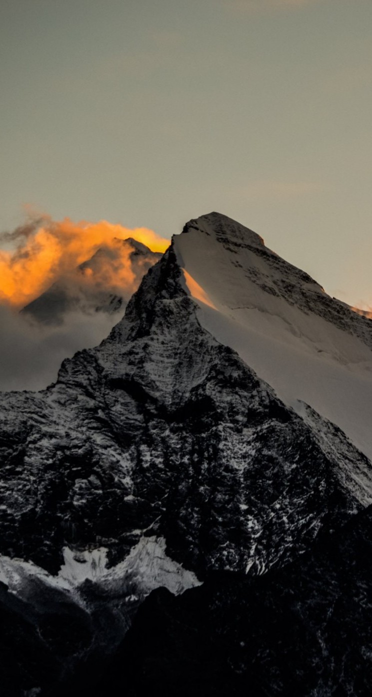 Description: A mountain with a cloud covered top and a yellow light on top of it's peak in the distance.