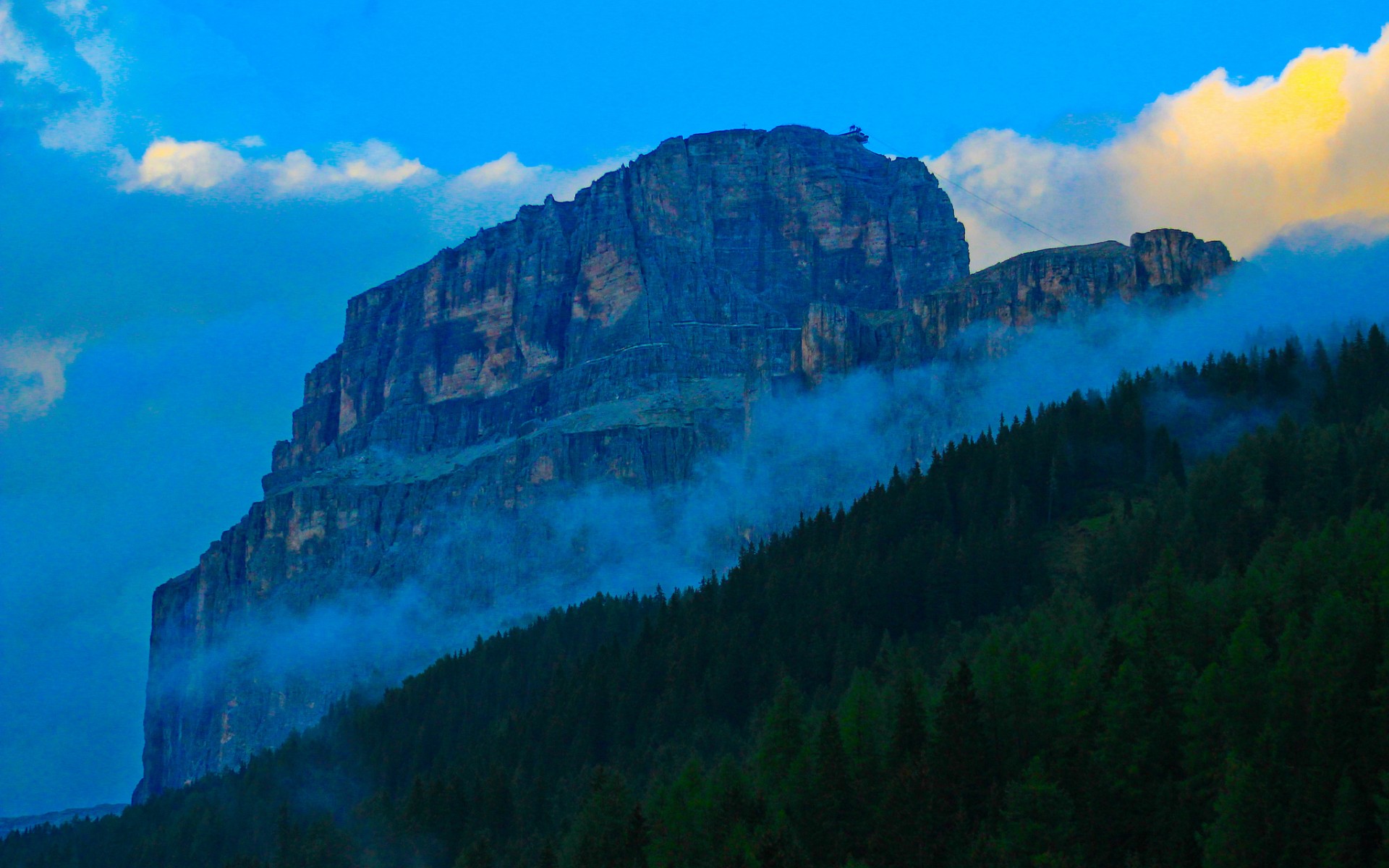 Description: A mountain with a very tall rock face on it's side with clouds coming from the top of it.