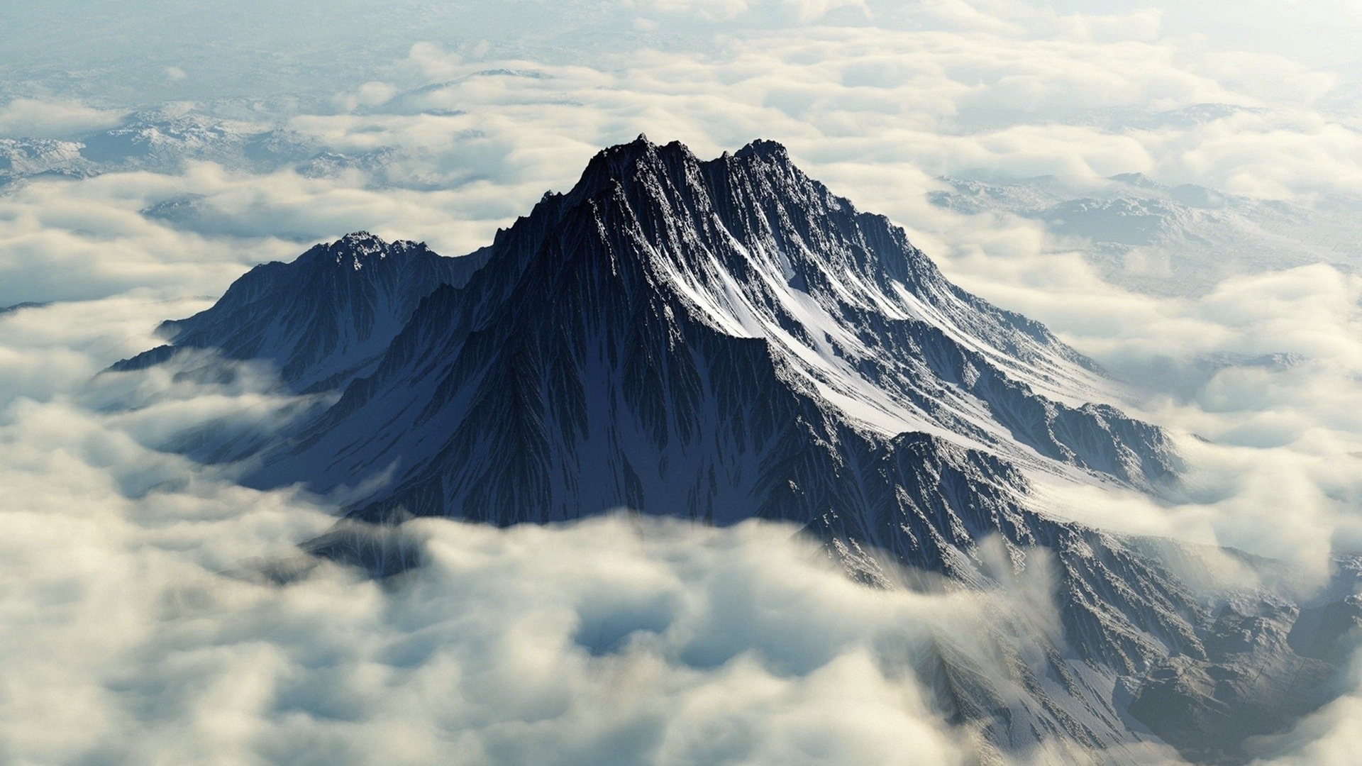 Description: A mountain is shown in the clouds above it's peaks and summits.