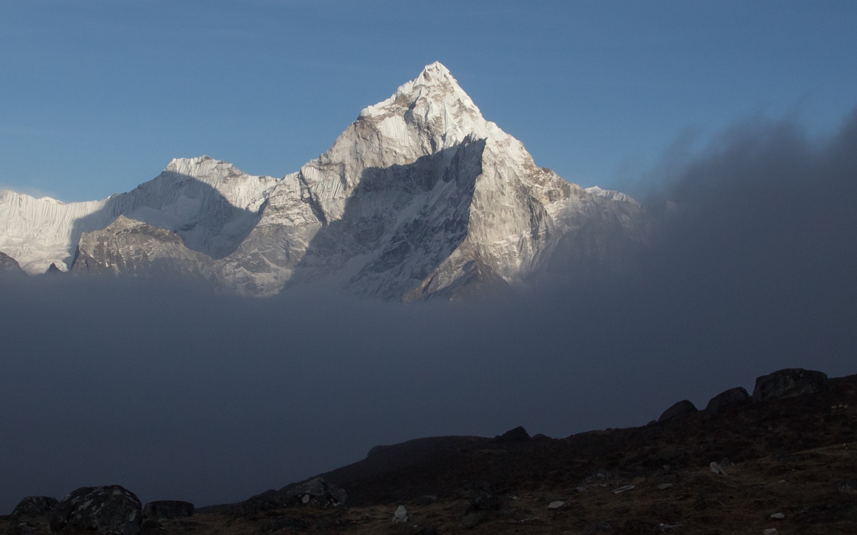 Description: A mountain covered in clouds and snow on a clear day with a blue sky above it and a few rocks below.