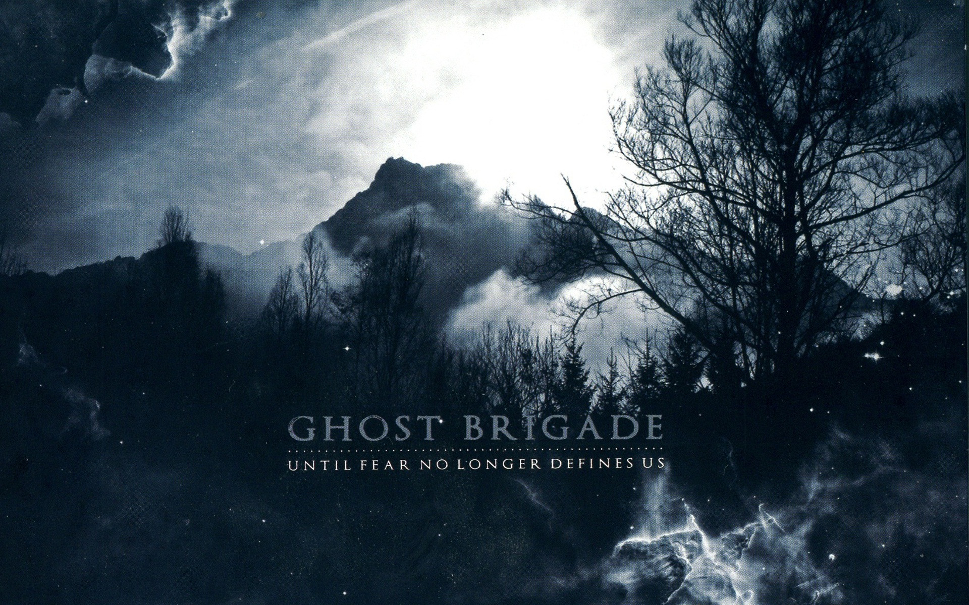 Description: A black and white photo of a mountain with clouds and trees in the foreground and a ghost brigade logo on the front.