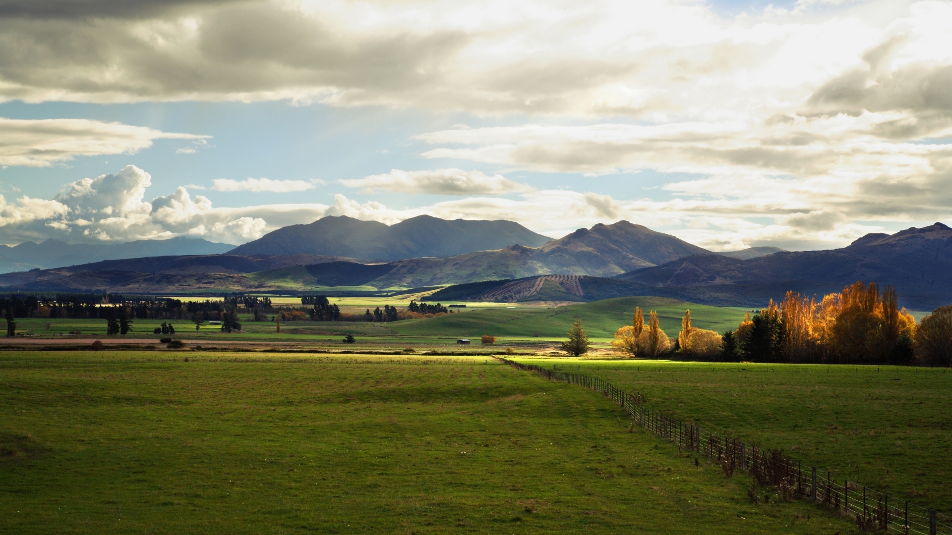 Description: A field with mountains in the background and a fence in the foreground with a fence in the foreground.