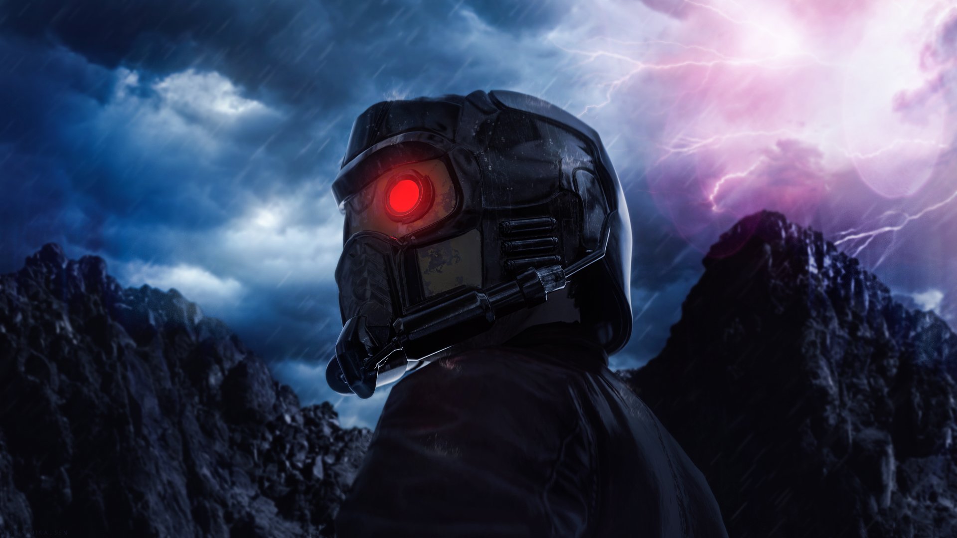 Description: A man in a helmet with a red light on his face in front of a mountain range with a lightning bolt.