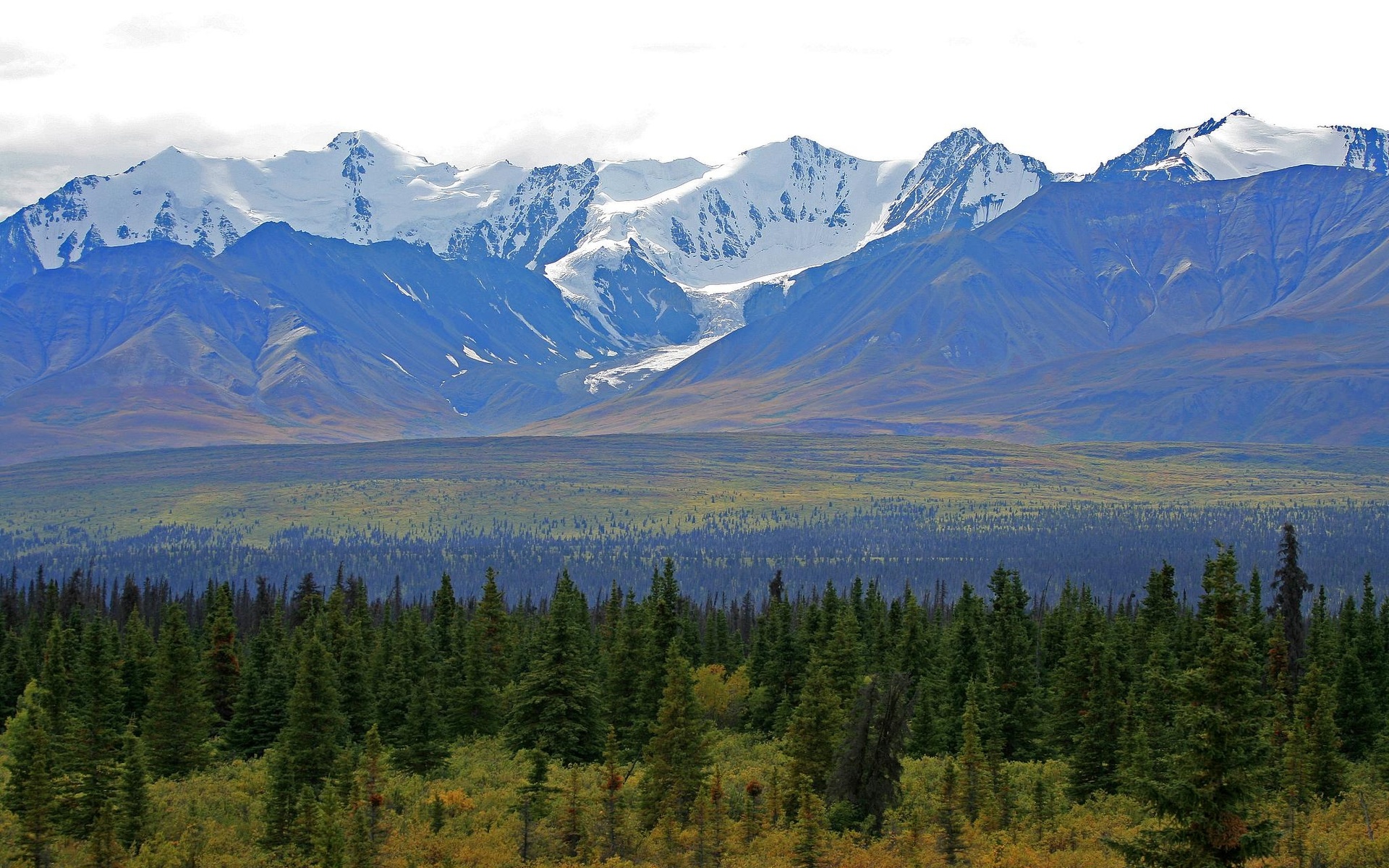 Description: A mountain range with a forest in the foreground and snow capped mountains in the background.