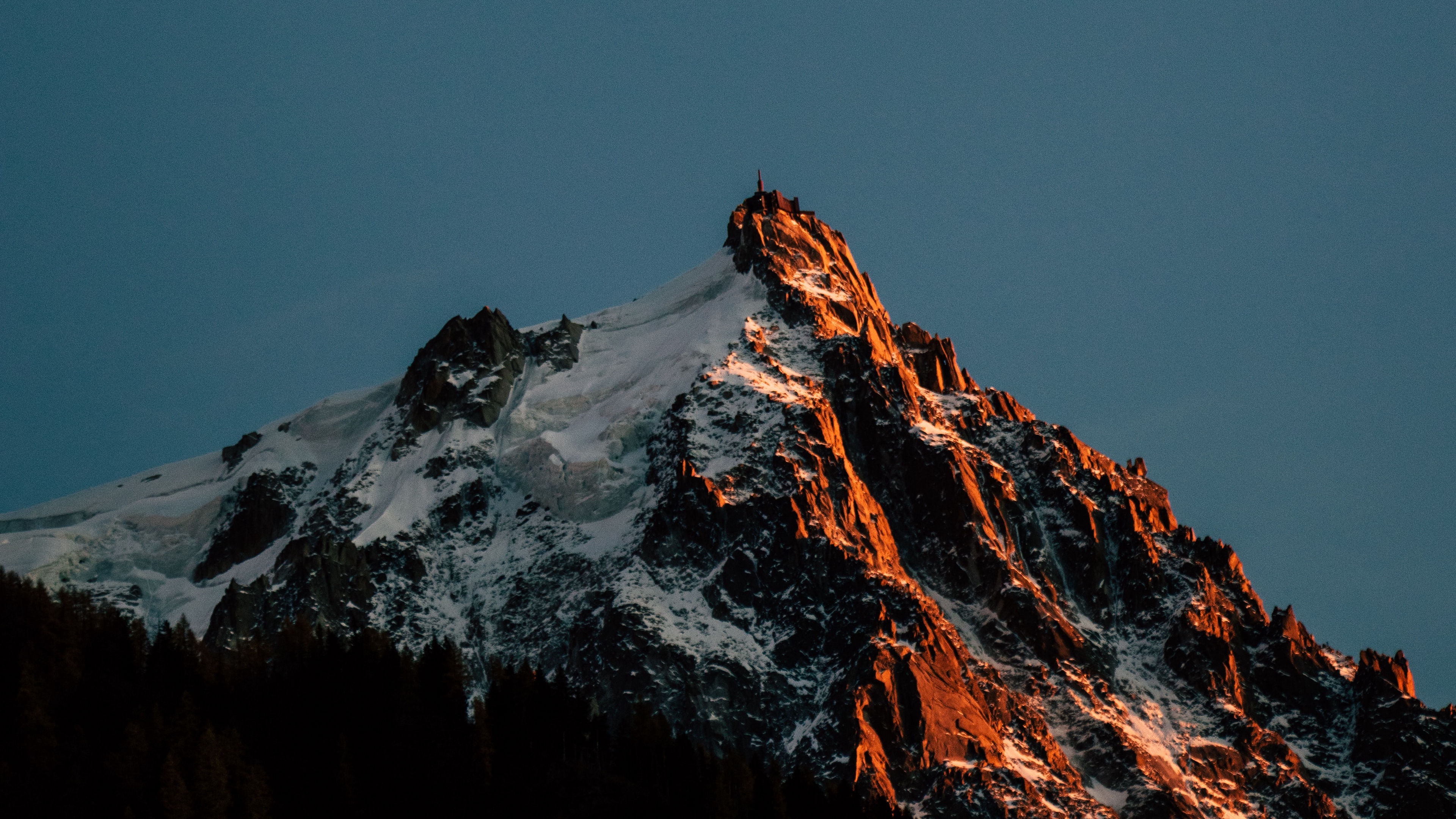 Description: A mountain with a snow covered peak and trees below it at night time with a full moon in the sky.