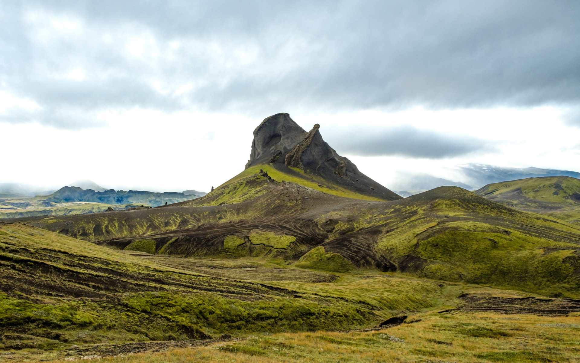 Description: A mountain with a grassy field below it and a cloudy sky above it.
