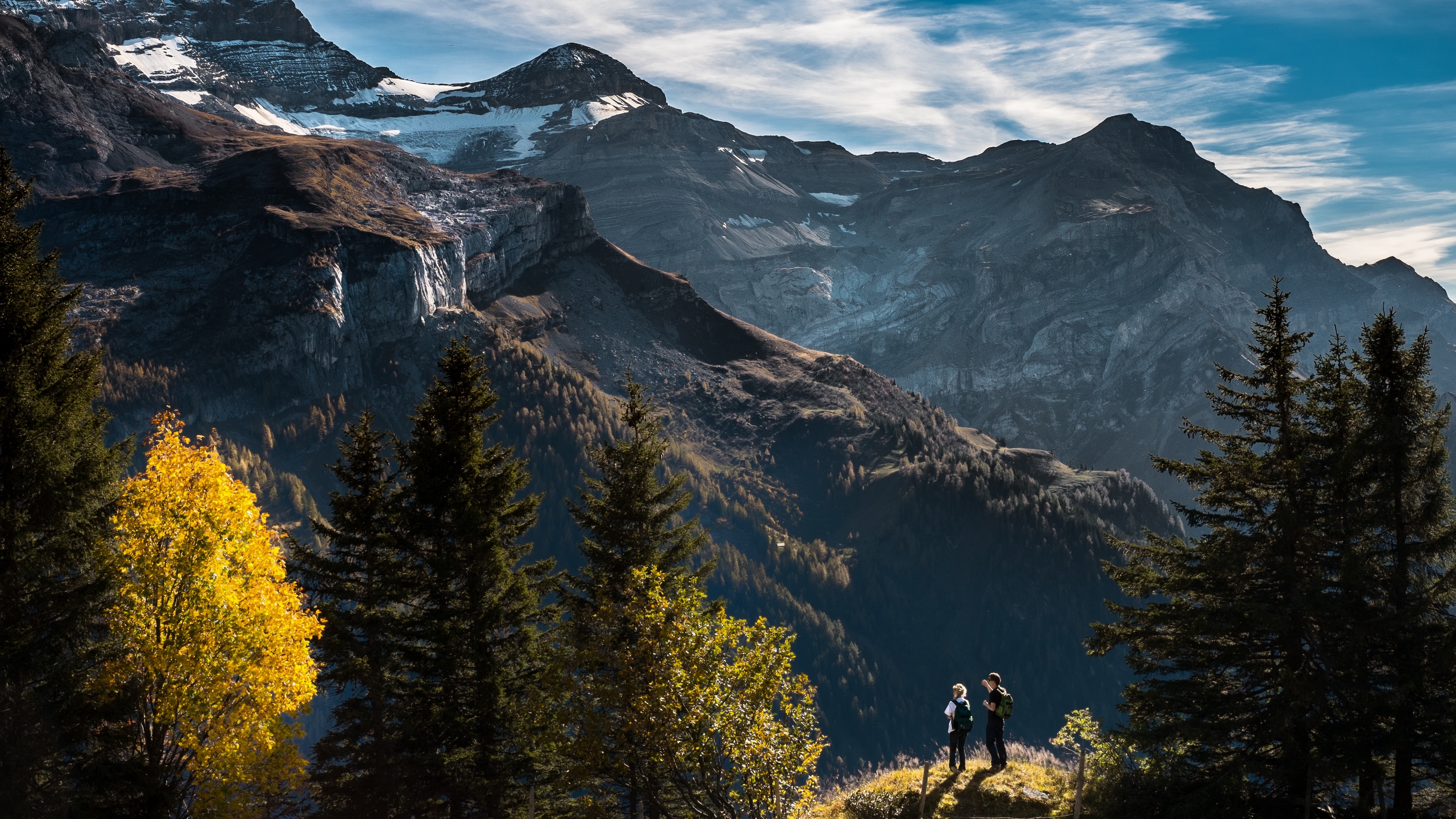 Description: Two people hiking up a mountain with a view of a waterfall and trees in the foreground and a mountain range in the background.