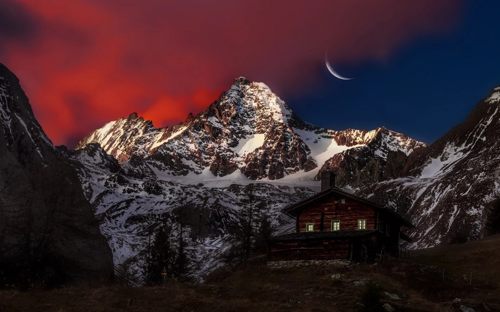 Description: A mountain with a house in the foreground and a red sky in the background with a crescent of light.