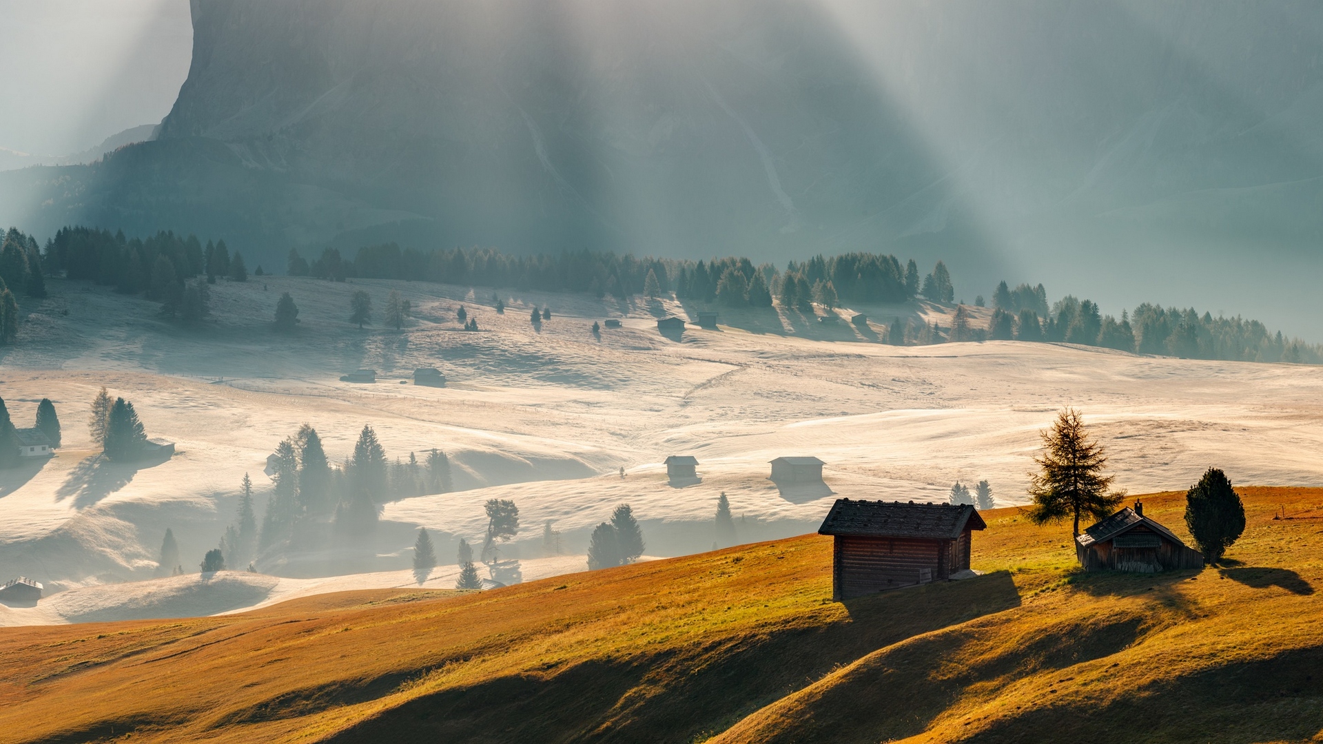 Description: A mountain with a house and trees on it and a sunbeam in the sky above it and a mountain with a house and trees on the hill.