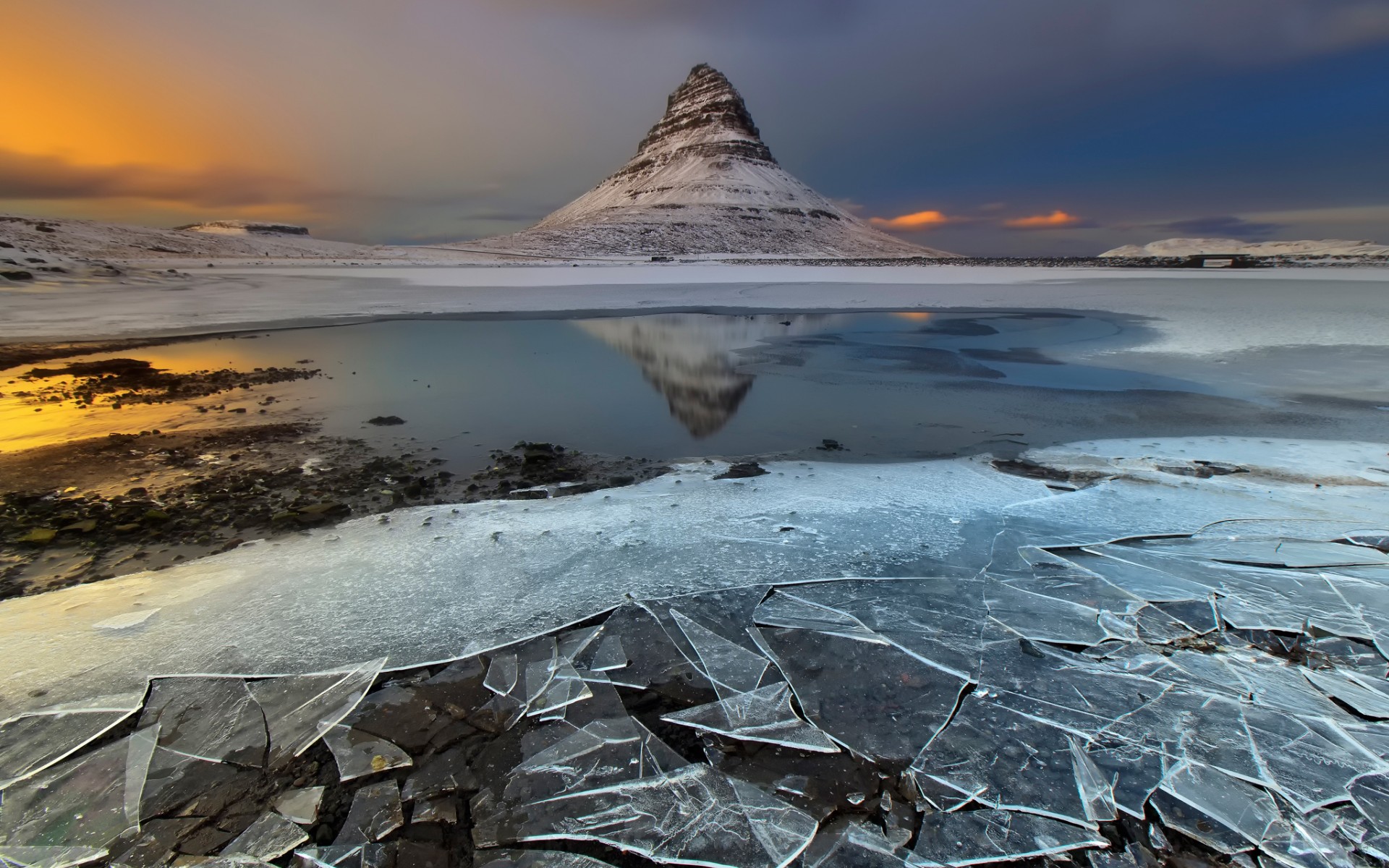 Description: A mountain is shown with ice on the ground and water in the foreground.