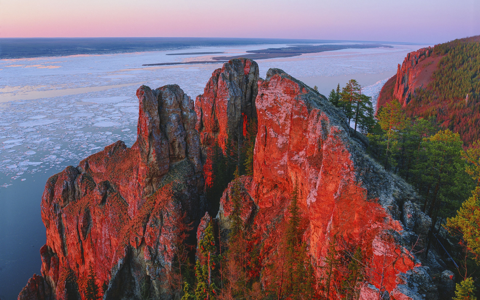 Description: A mountain with a lake in the background and a few trees on the side of it with ice on the water.