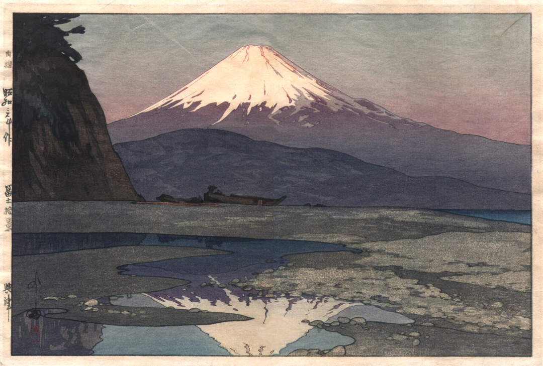 Description: A painting of a mountain with a lake in front of it and a boat in the water below it.