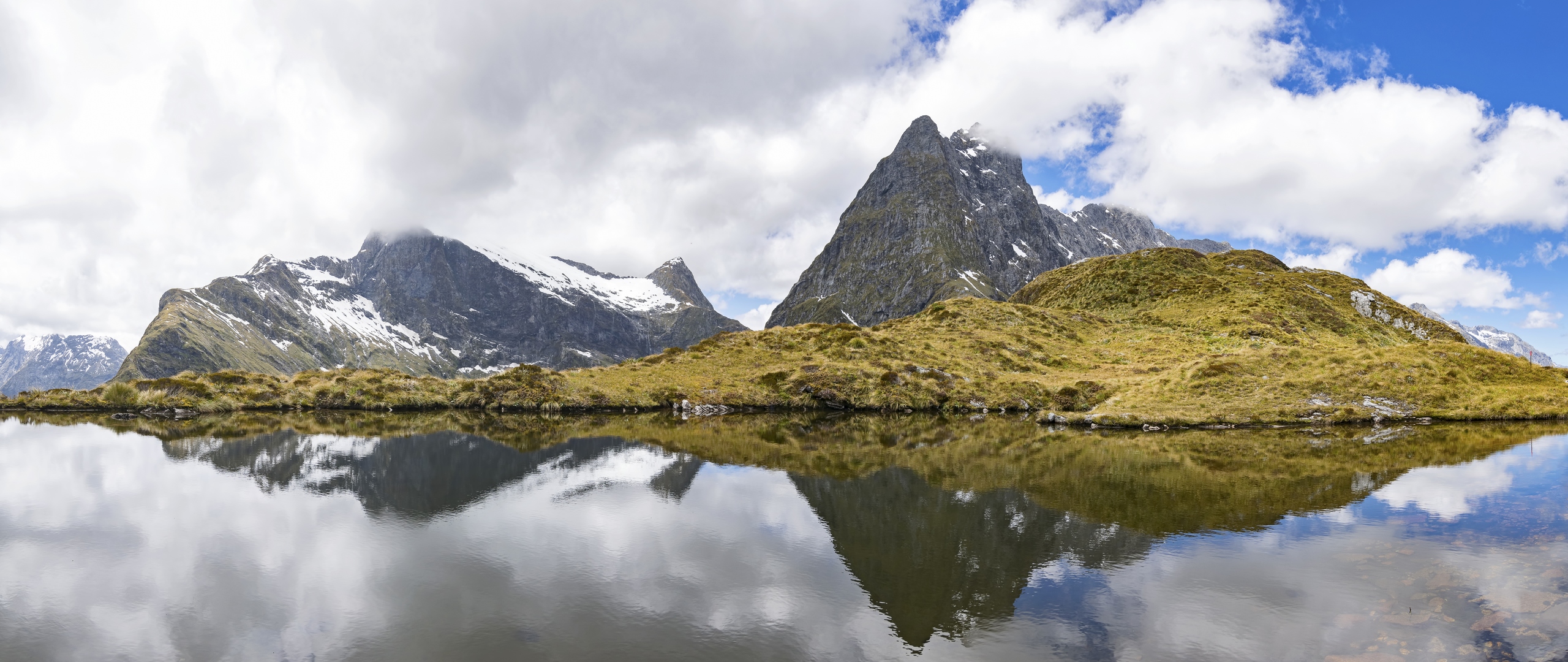 Description: A mountain range with a lake in front of it and a few clouds in the sky above it and a few mountains in the background.
