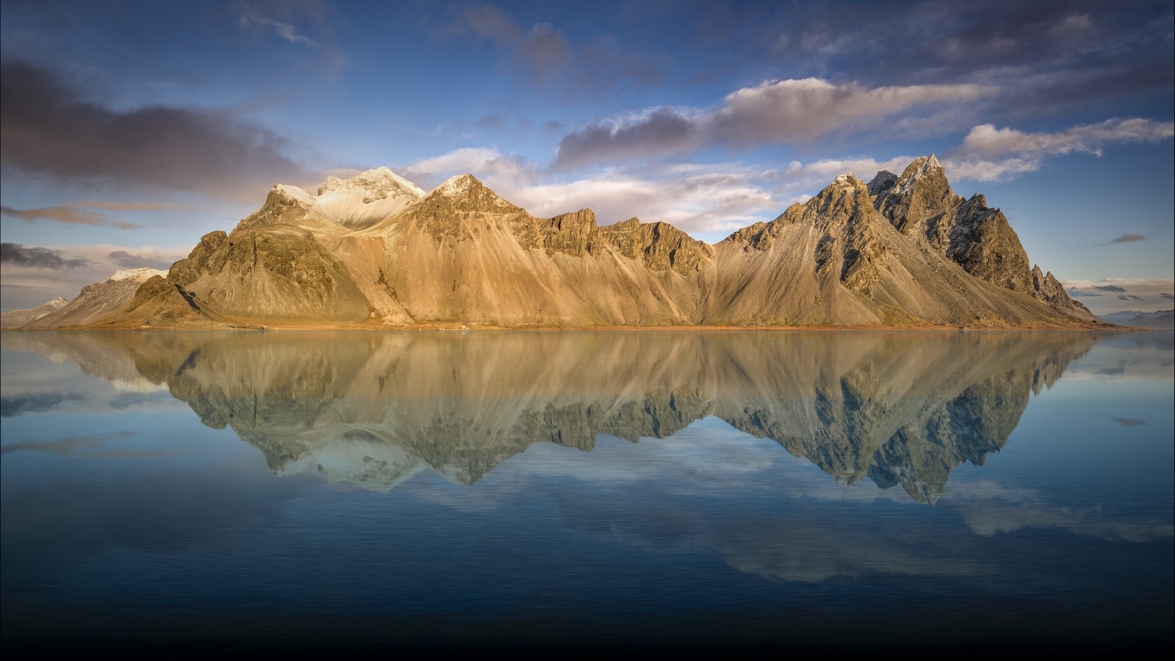 Description: A mountain range with a lake in front of it and a cloudy sky above it with a few clouds.