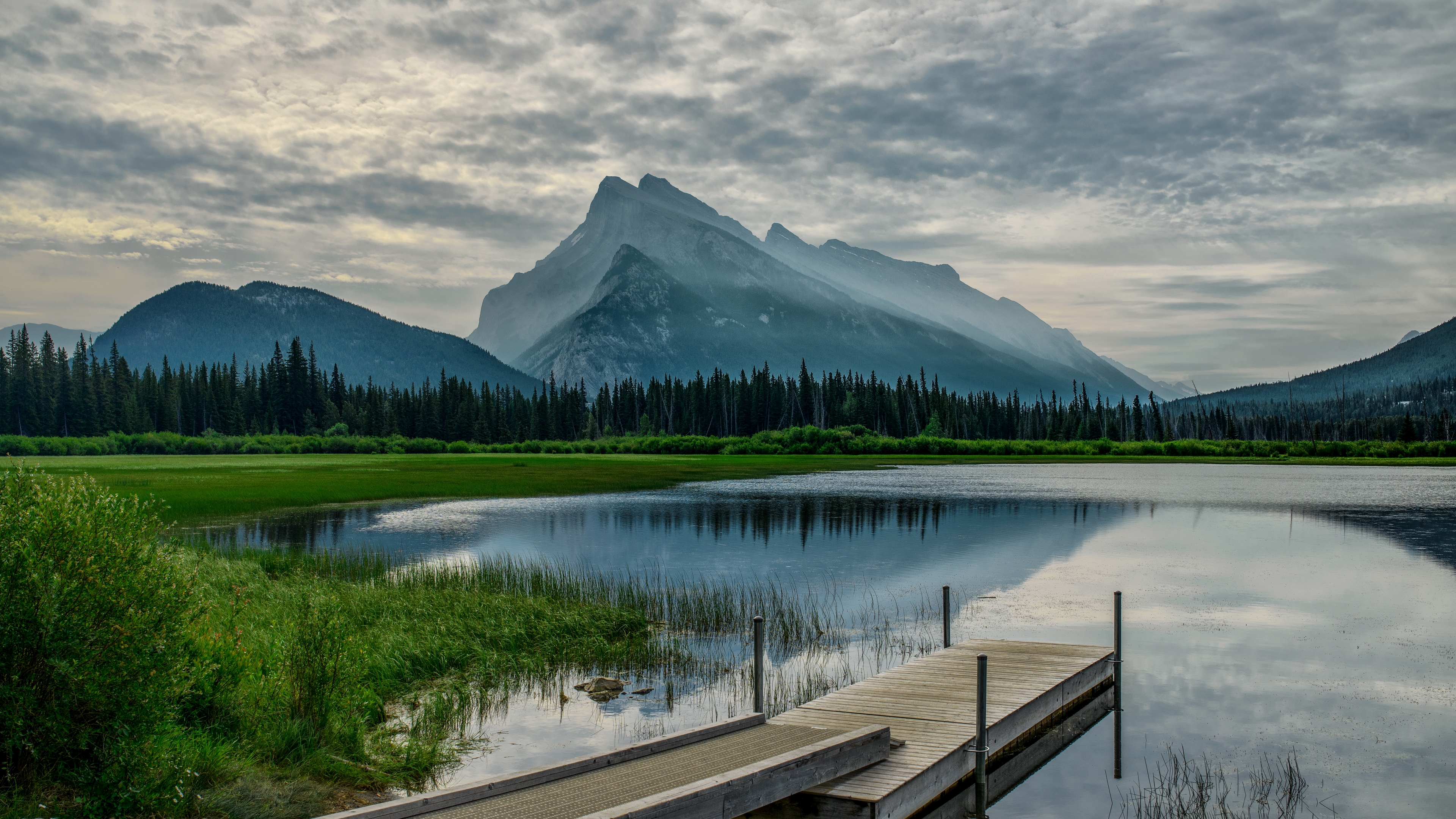 Description: A dock is sitting in the water near a mountain range and a lake with a dock in the foreground.
