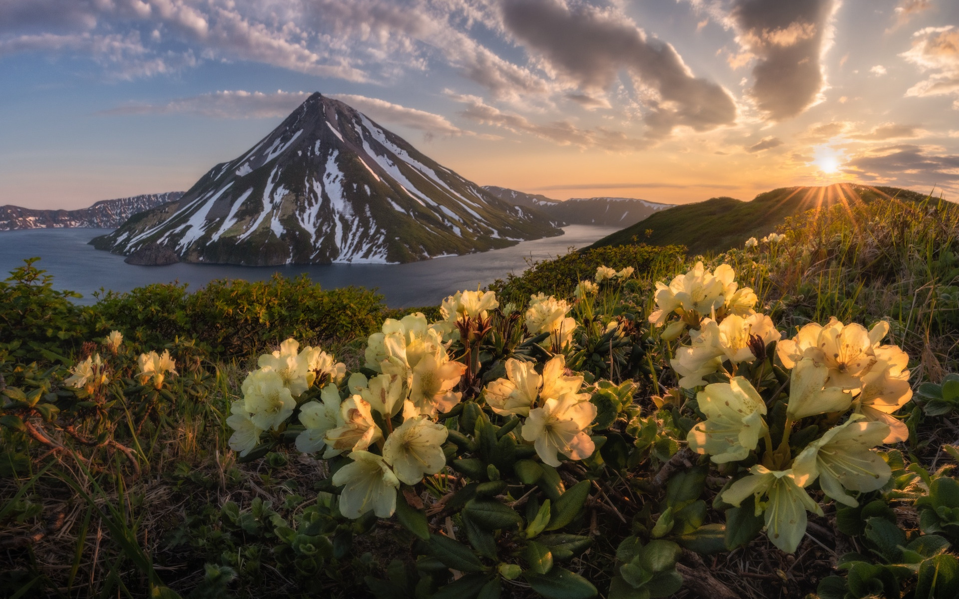 Description: A mountain with a lake and flowers in the foreground and a snow capped mountain in the background with a sun setting.