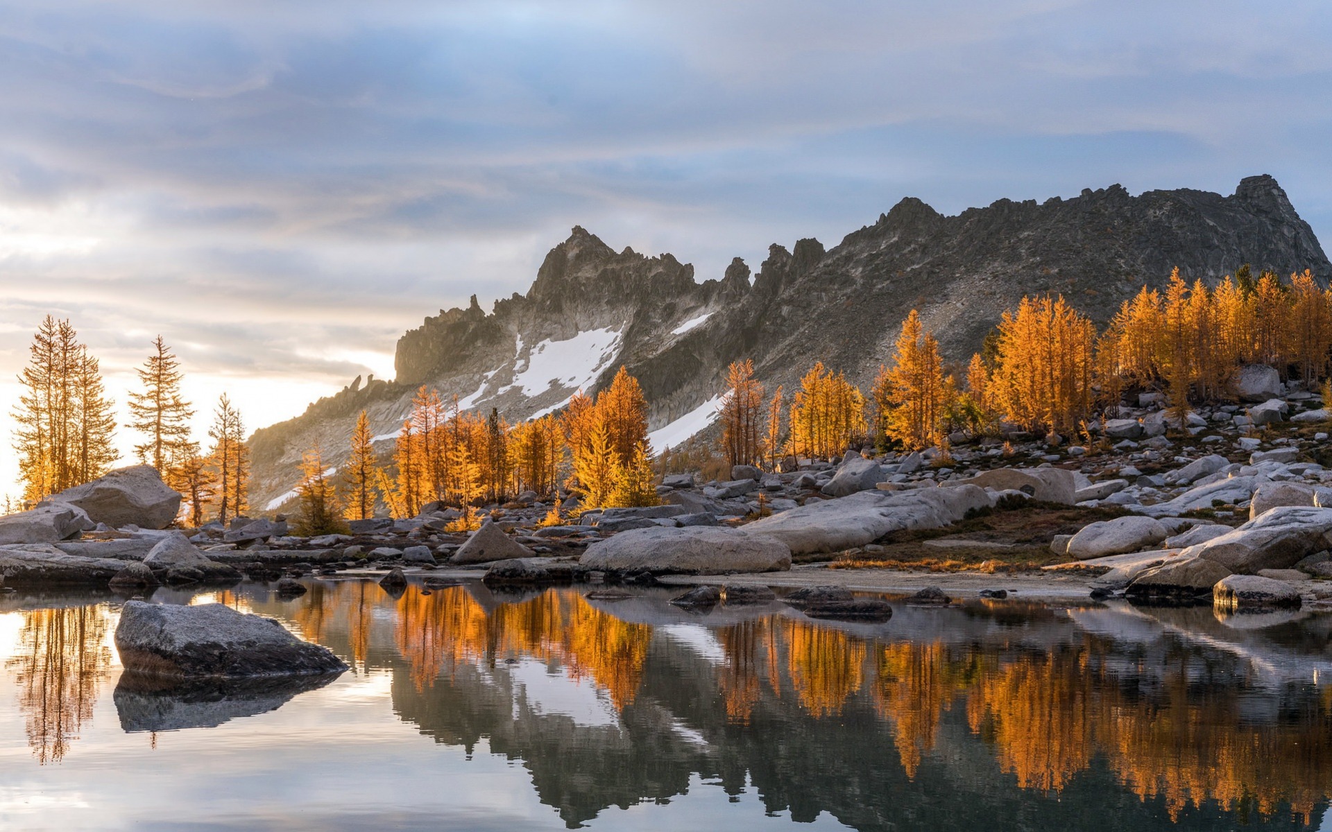 Description: A mountain range with a lake surrounded by rocks and trees with yellow leaves on them and a cloudy sky.