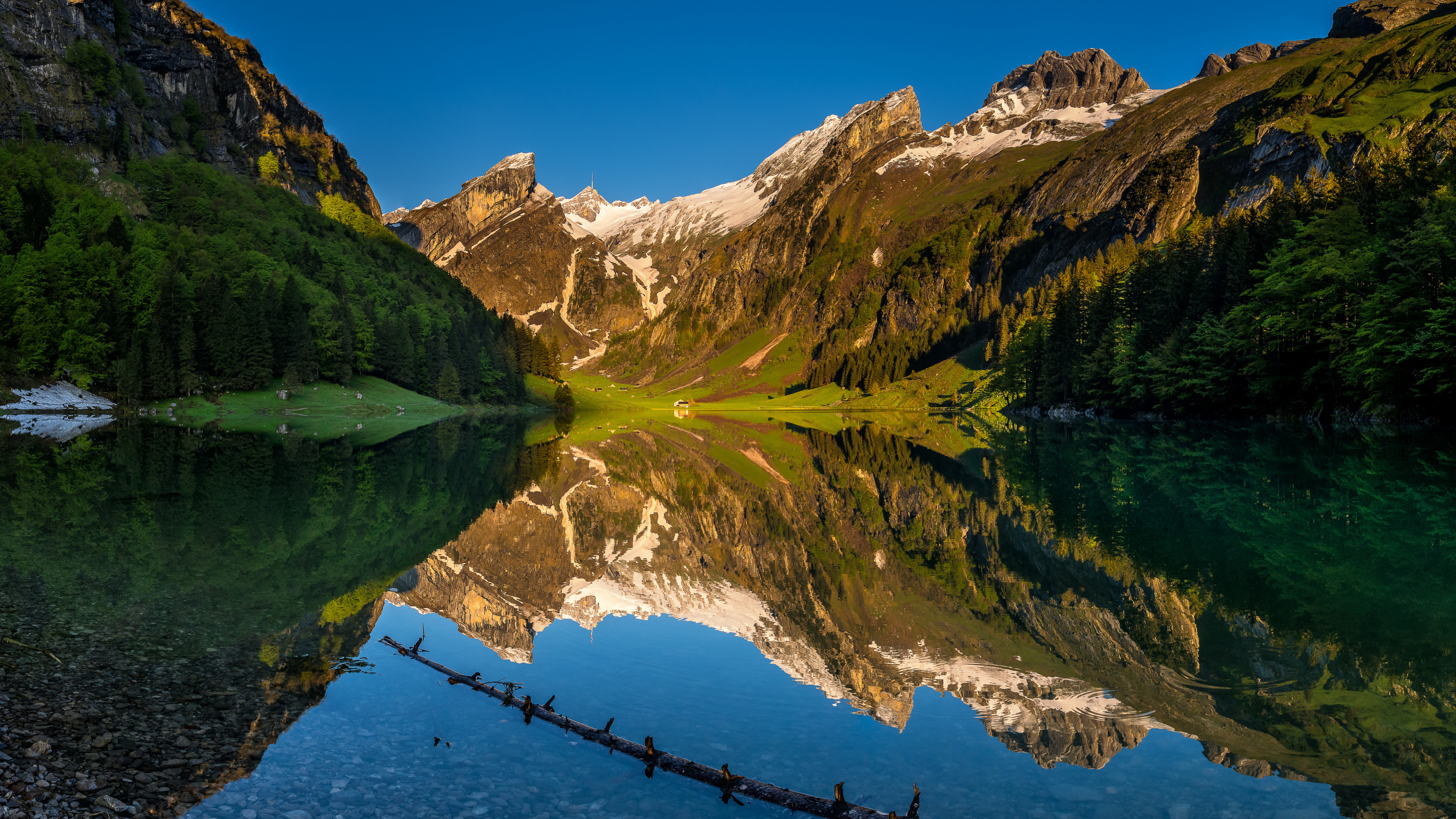 Description: A mountain range with a lake surrounded by trees and a forest in the foreground with a clear sky.
