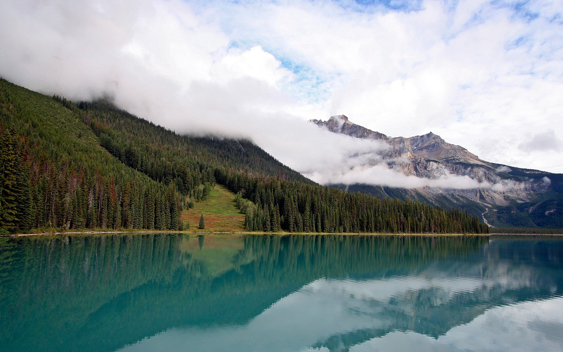 Description: A mountain range with a lake surrounded by trees and clouds in the sky with a few clouds in the sky.
