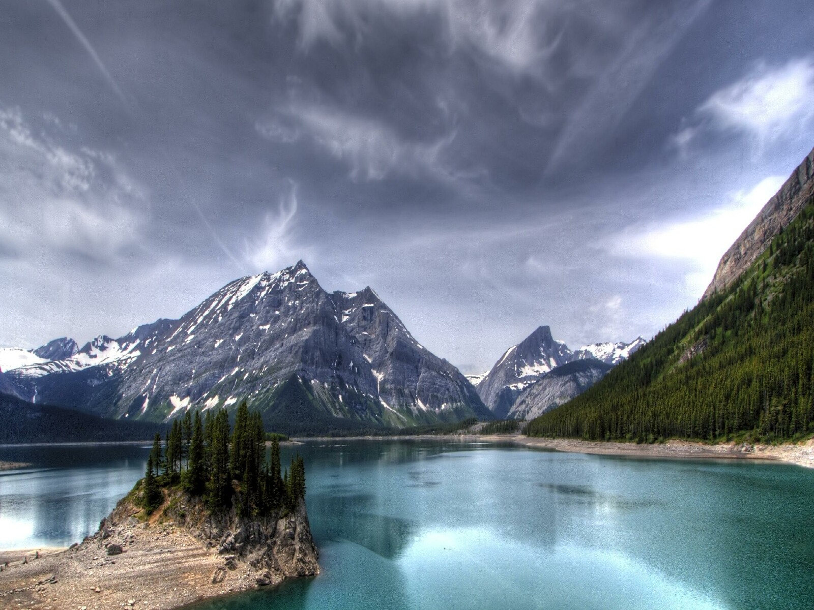 Description: A mountain range with a lake in the foreground and a forest in the background with a cloudy sky.