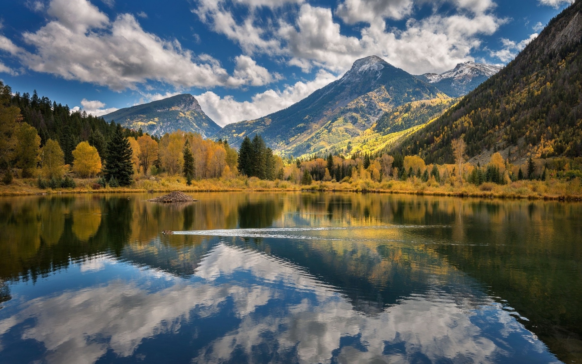 Description: A mountain range with a lake surrounded by trees and clouds in the sky with a few clouds in the water.