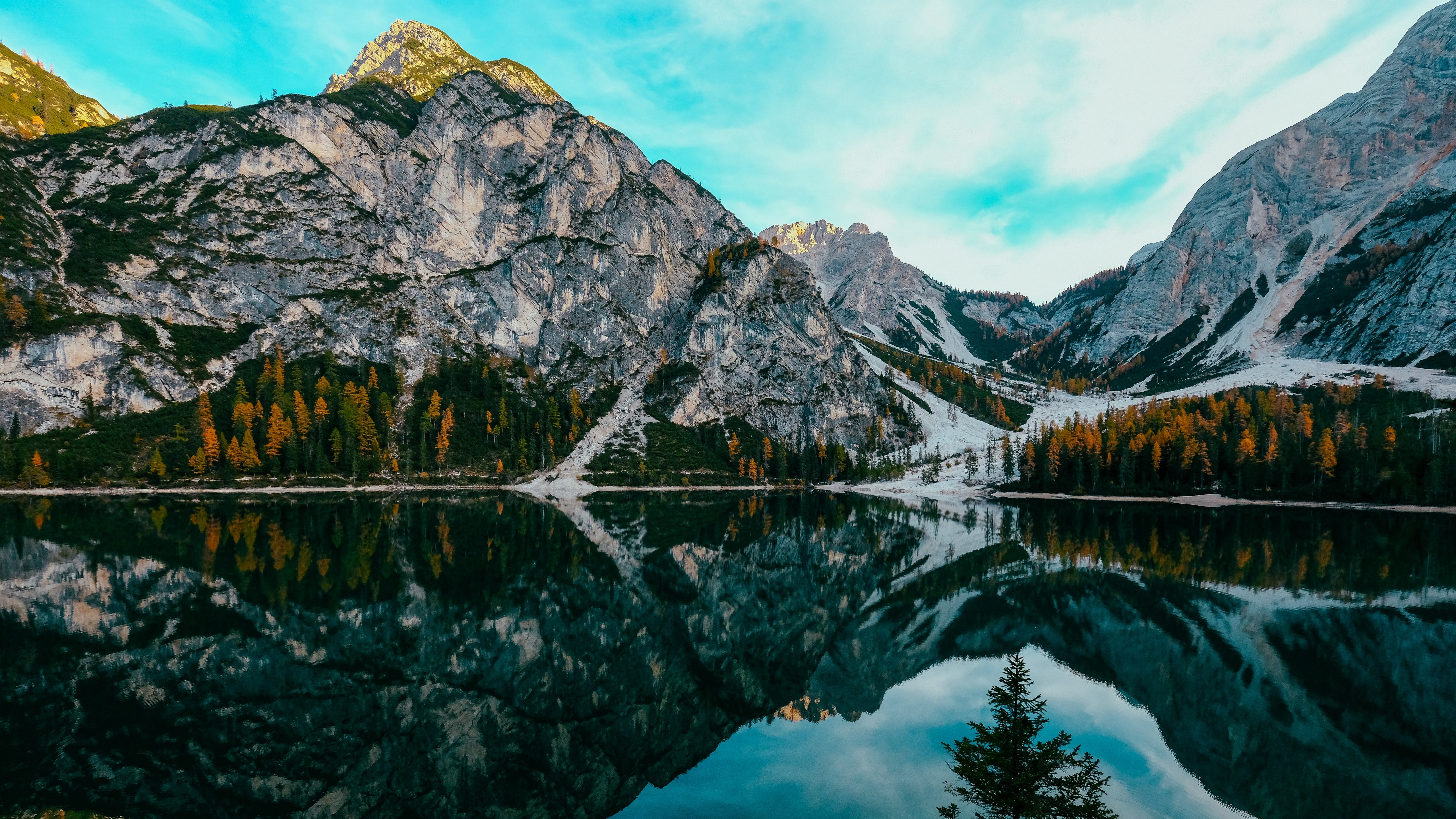 Description: A mountain range with a lake surrounded by trees and snow on the ground and a blue sky with clouds.