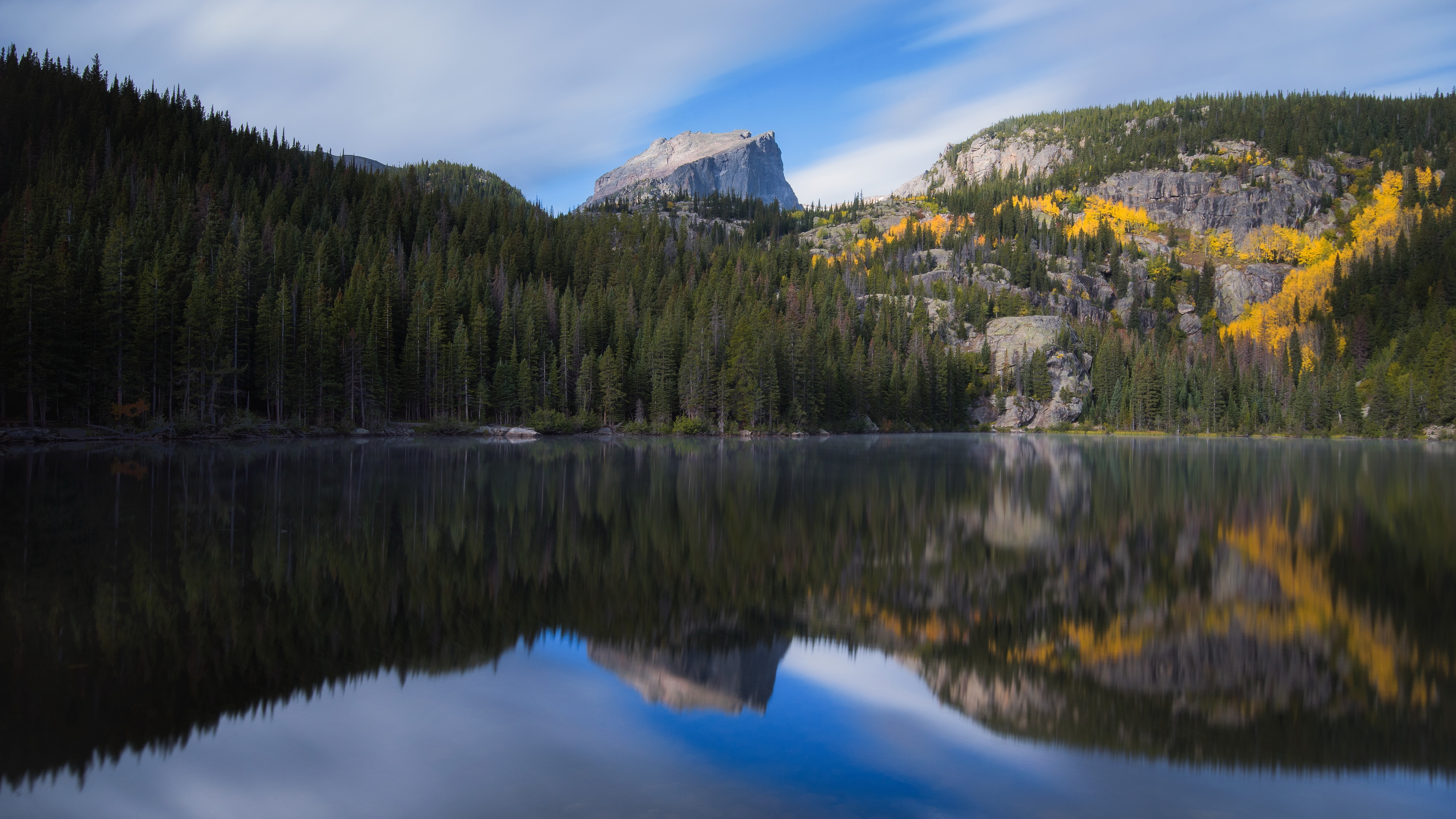 Description: A mountain with a lake surrounded by trees and a forest with yellow leaves on it and a blue sky with clouds.