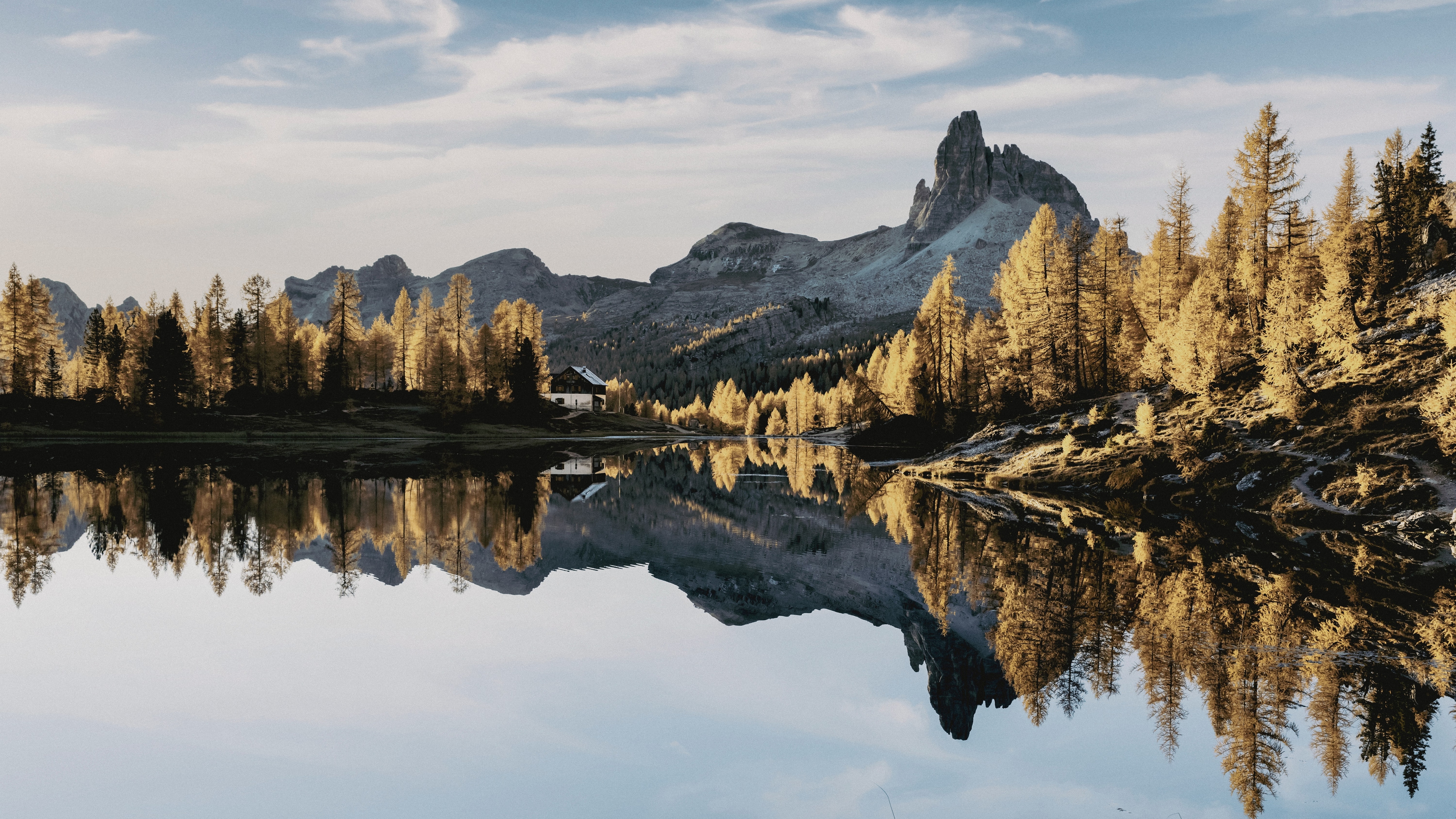 Description: A mountain range with a lake surrounded by trees and a forest with yellow leaves on it and a blue sky with clouds.