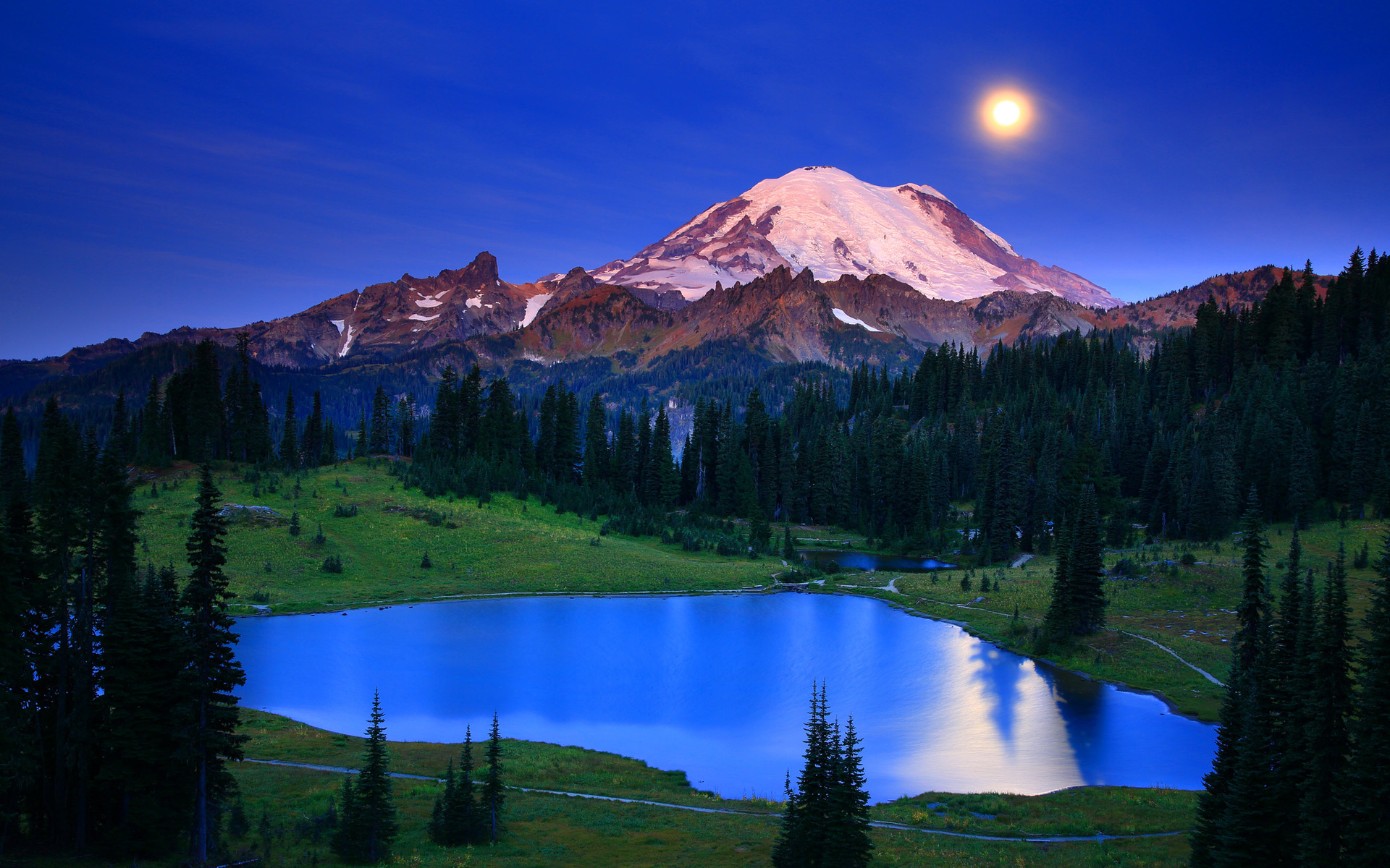 Description: A mountain with a lake in the foreground and a full moon in the background with a blue sky.