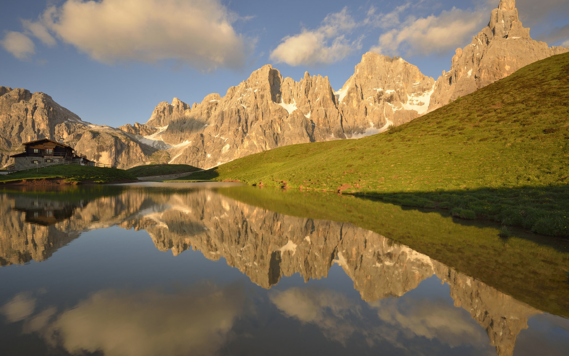 Description: A mountain range with a lake in front of it and a house on the other side of the mountain.