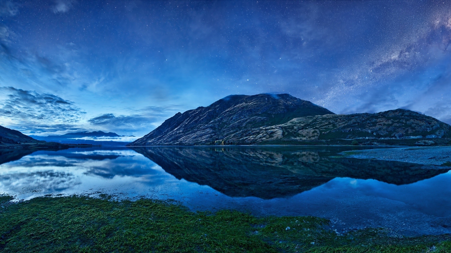 Description: A mountain range with a lake and a sky filled with stars and clouds at night with a full moon.