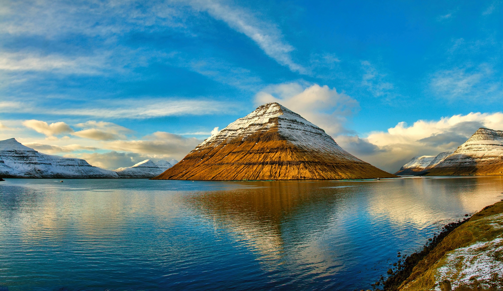 Description: A mountain range is reflected in the water of a lake with snow on the mountains in the background and a blue sky with clouds.