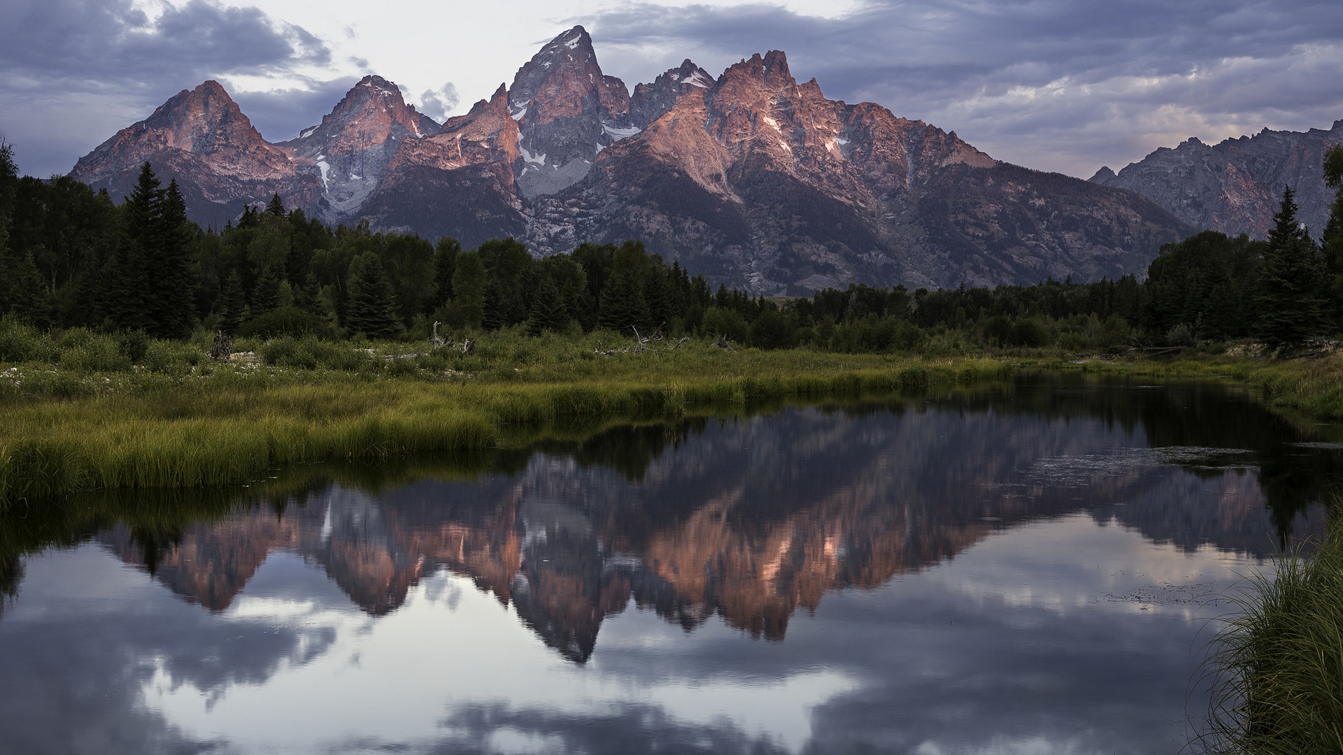 Description: A mountain range is reflected in a lake with a sky background and clouds in the sky above it.