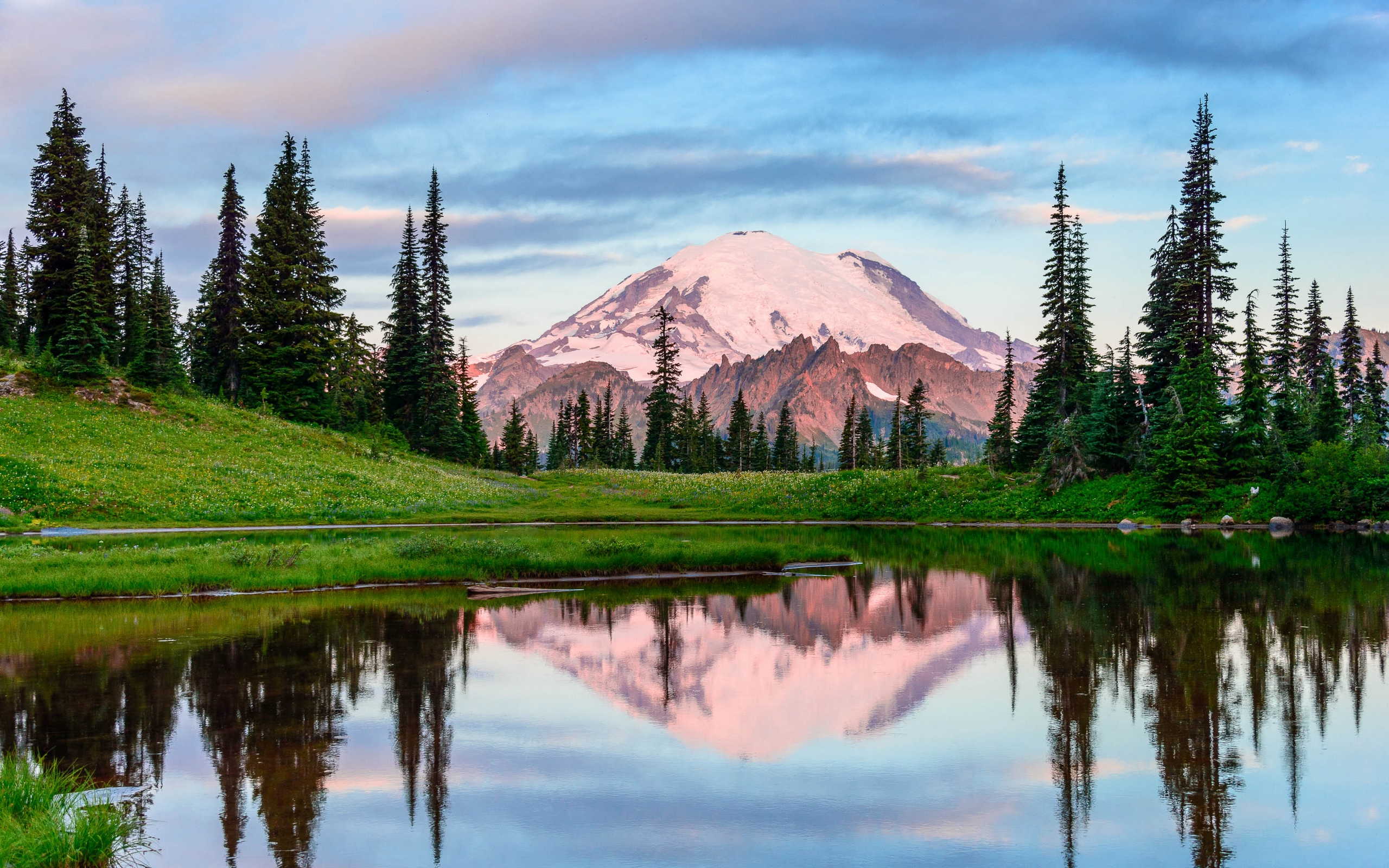 Description: A mountain with a snow capped peak is reflected in a lake surrounded by trees and grass on a sunny day.