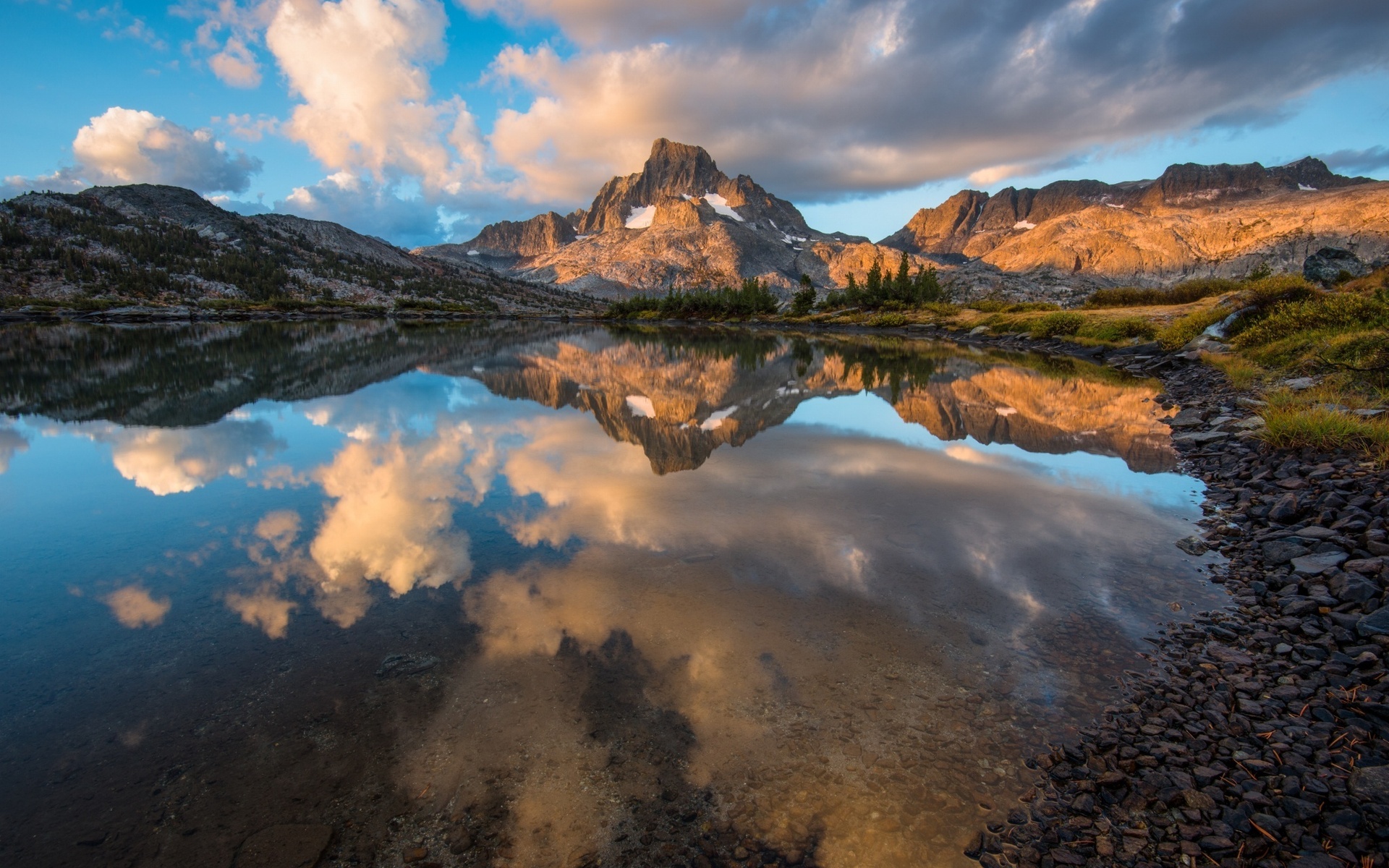 Description: A mountain range with a lake and clouds reflecting in it's water and a few trees in the foreground.