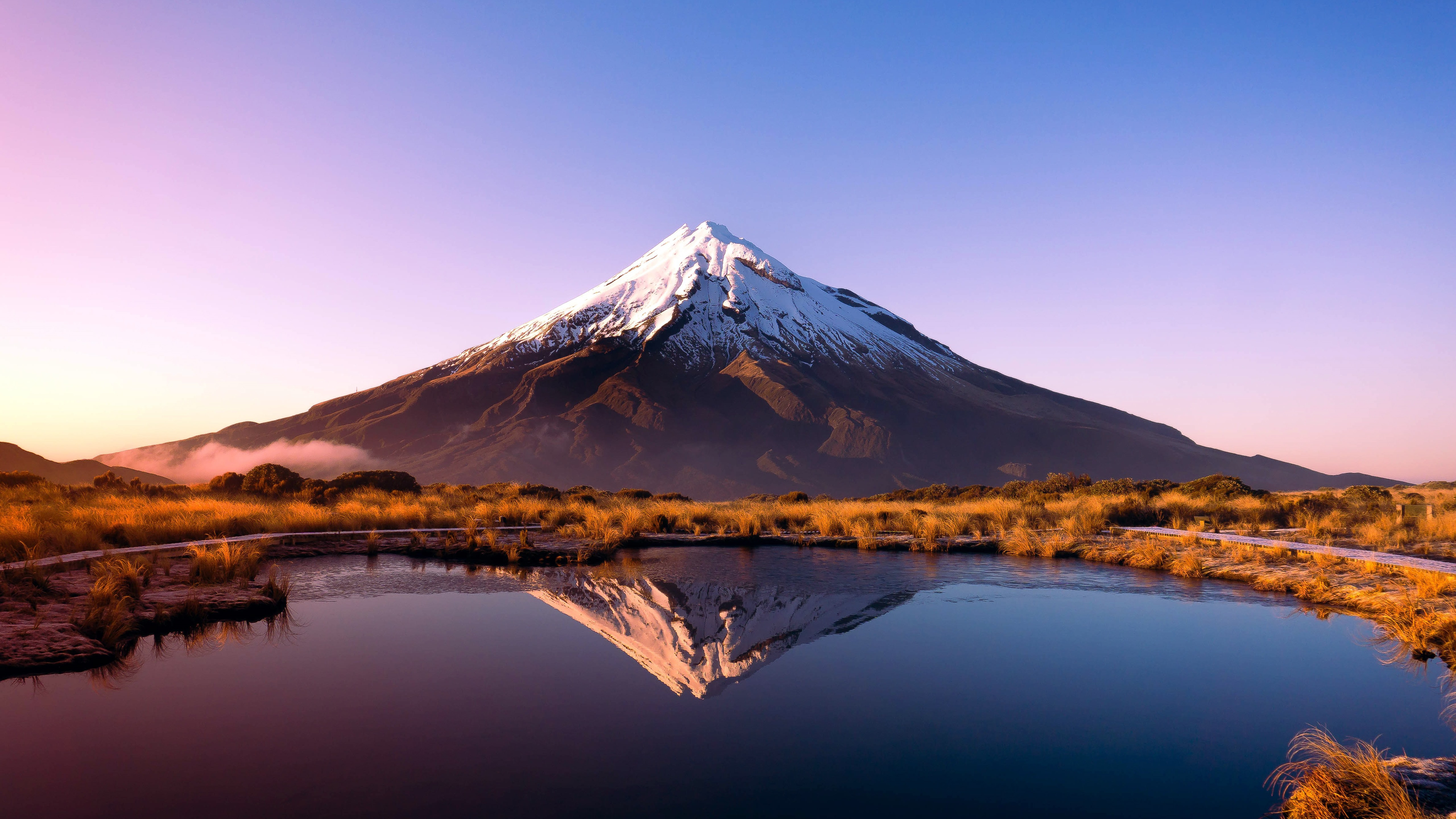 Description: A mountain with a lake in front of it and a road passing by it and a bridge in the foreground.