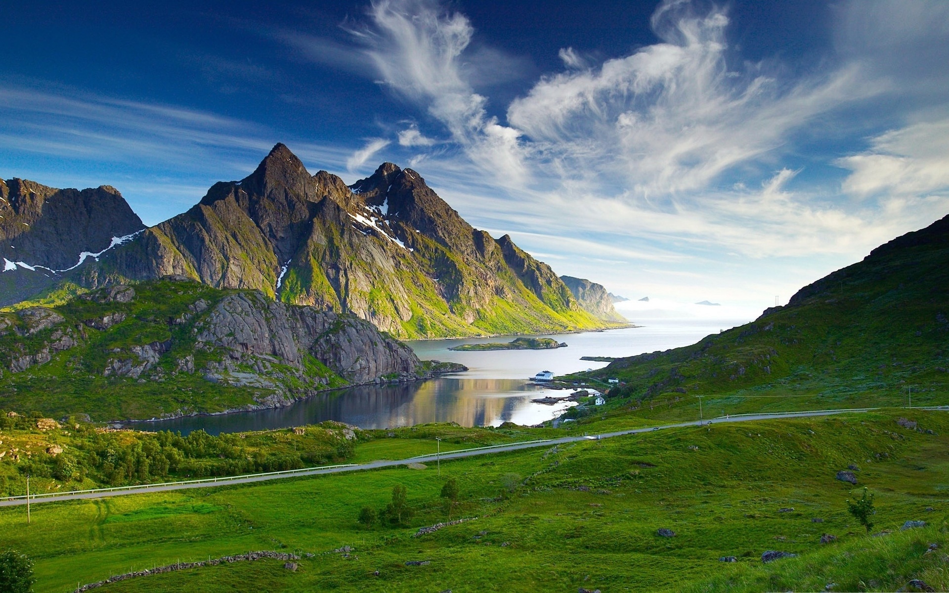 Description: A scenic view of a mountain range with a lake in the middle of it and a road winding through it.
