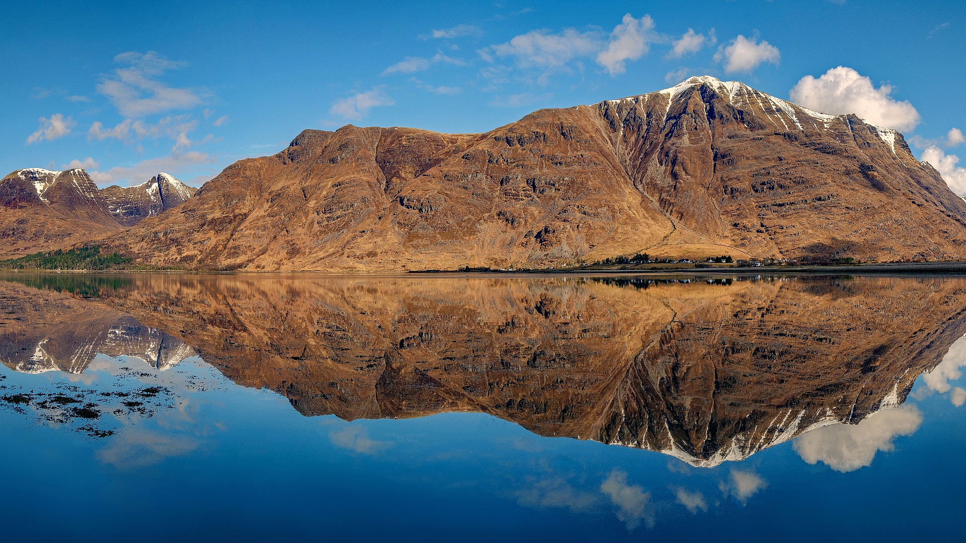 Description: A mountain range with a lake in front of it and a sky background with clouds in the sky and a few clouds in the water.