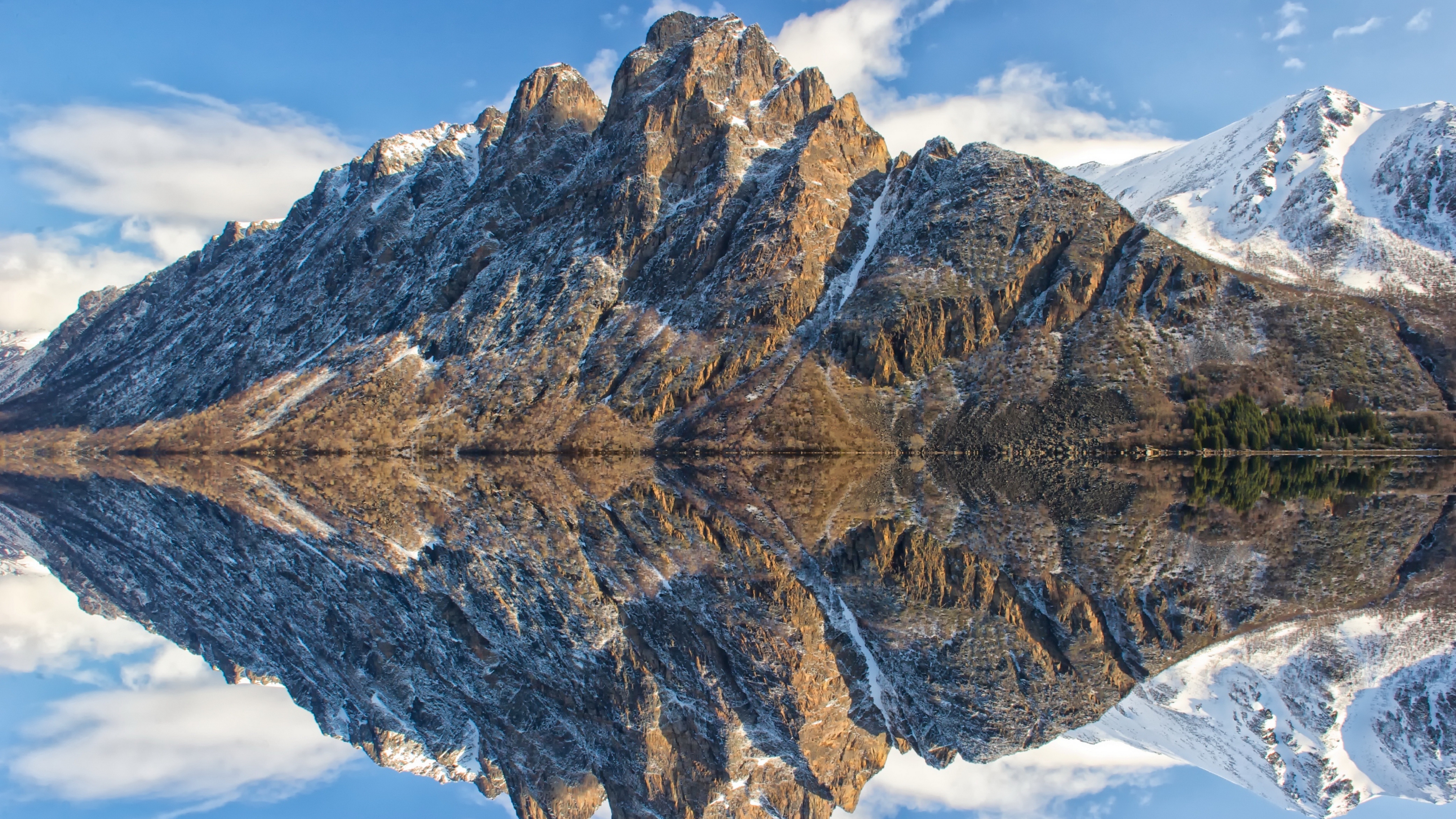 Description: A mountain range with a lake in front of it and a sky background with clouds reflected in the water.