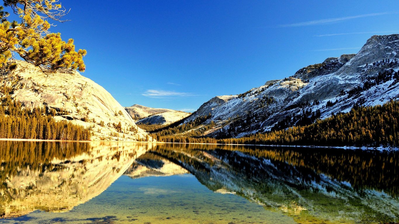 Description: A mountain lake surrounded by snow covered mountains and trees in the foreground with a clear blue sky above.