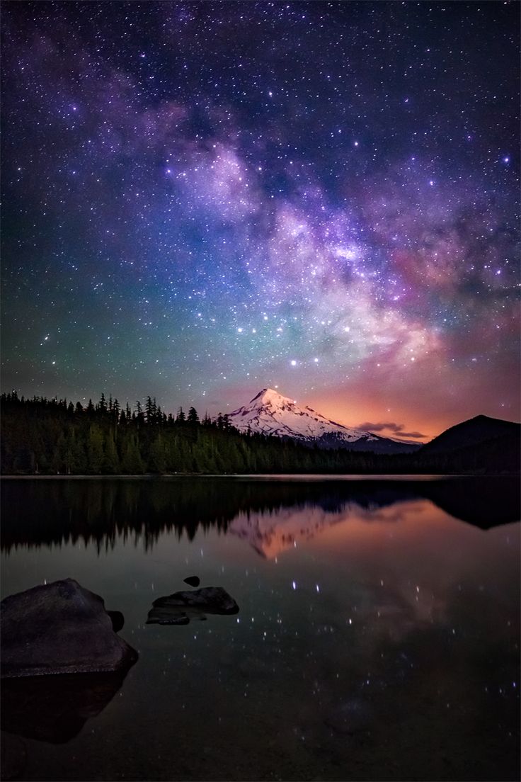 Description: A mountain range with a lake and stars in the sky above it and a lake below it with rocks and trees.
