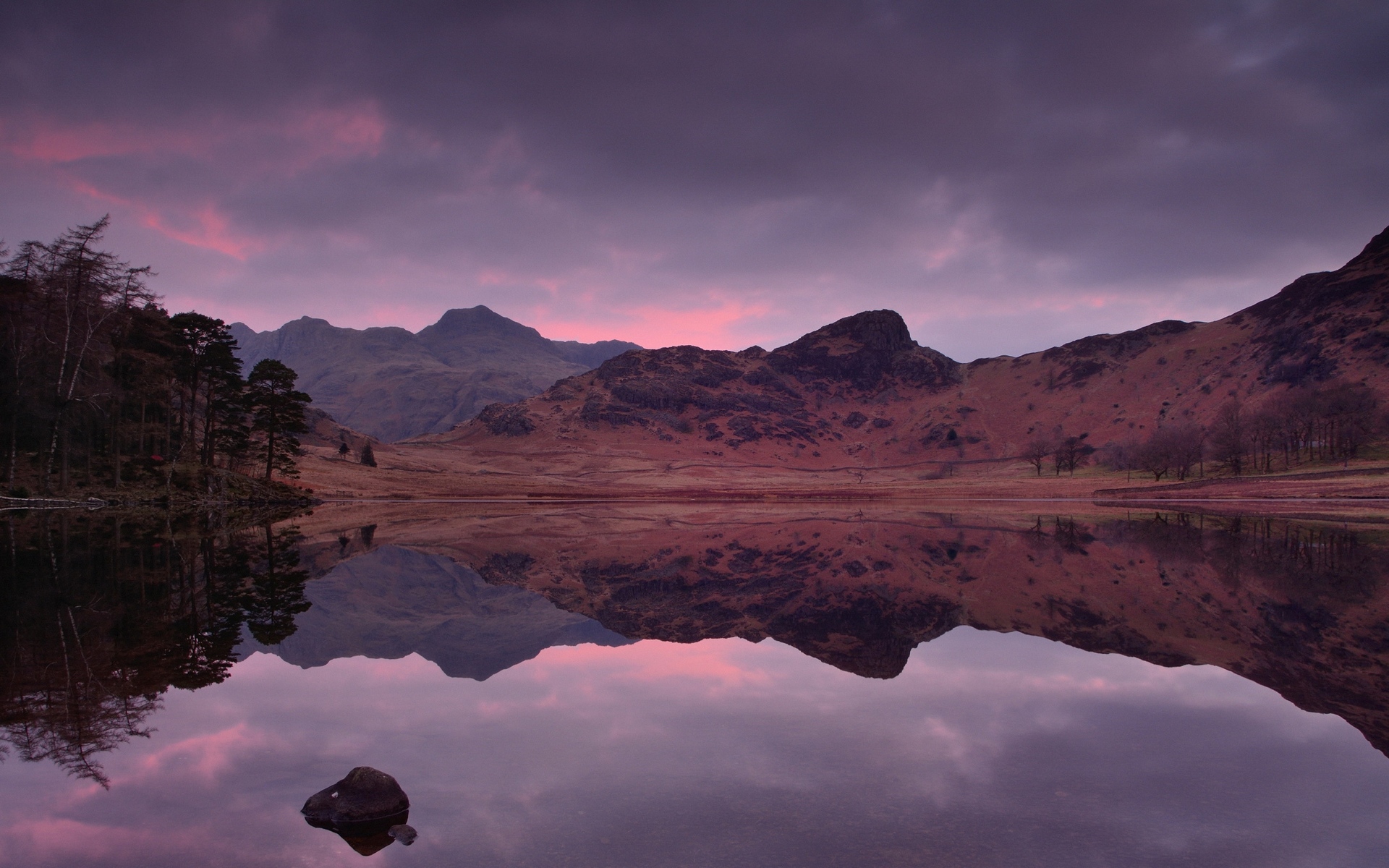 Description: A mountain range with a lake in the foreground and a pink sky in the background with clouds in the sky.