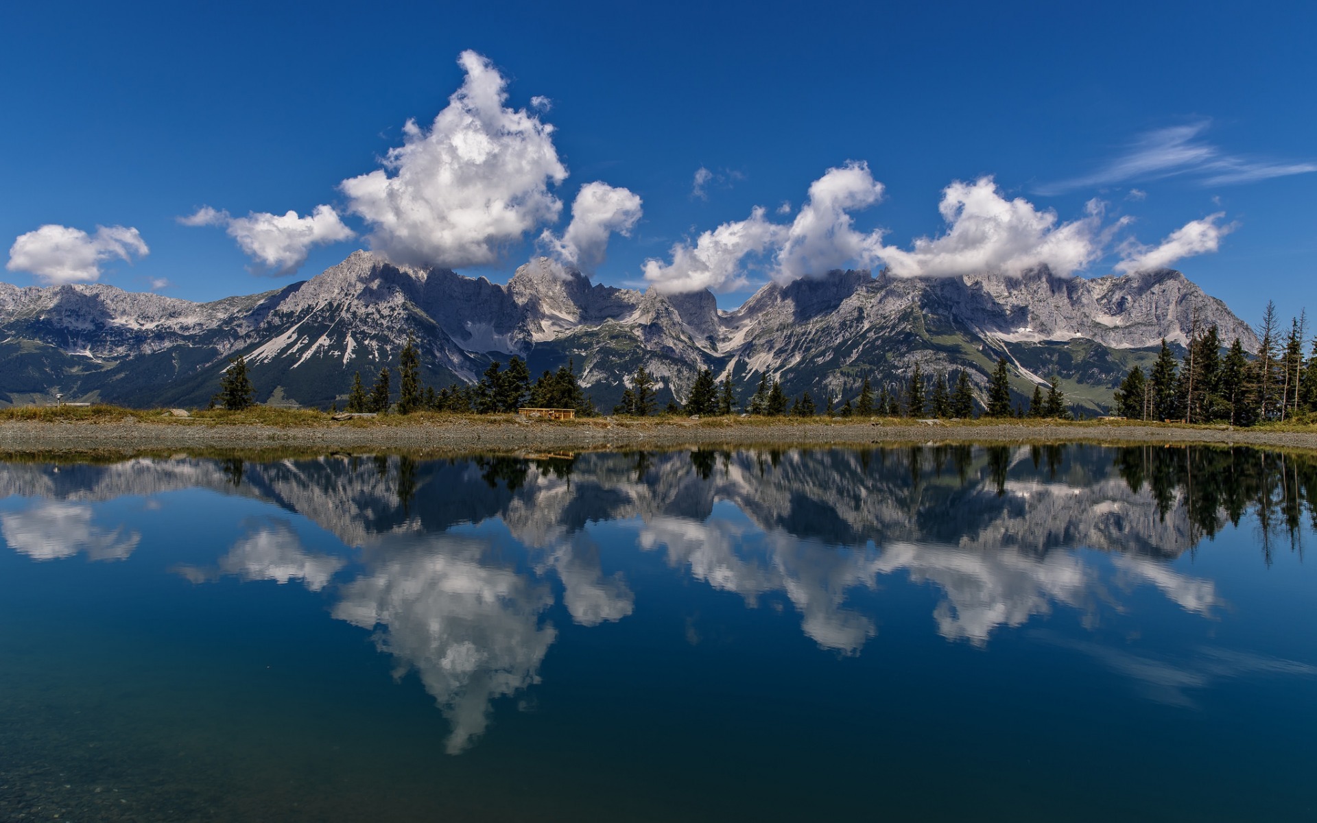 Description: A mountain range with a lake and trees in the foreground and clouds in the sky above it.