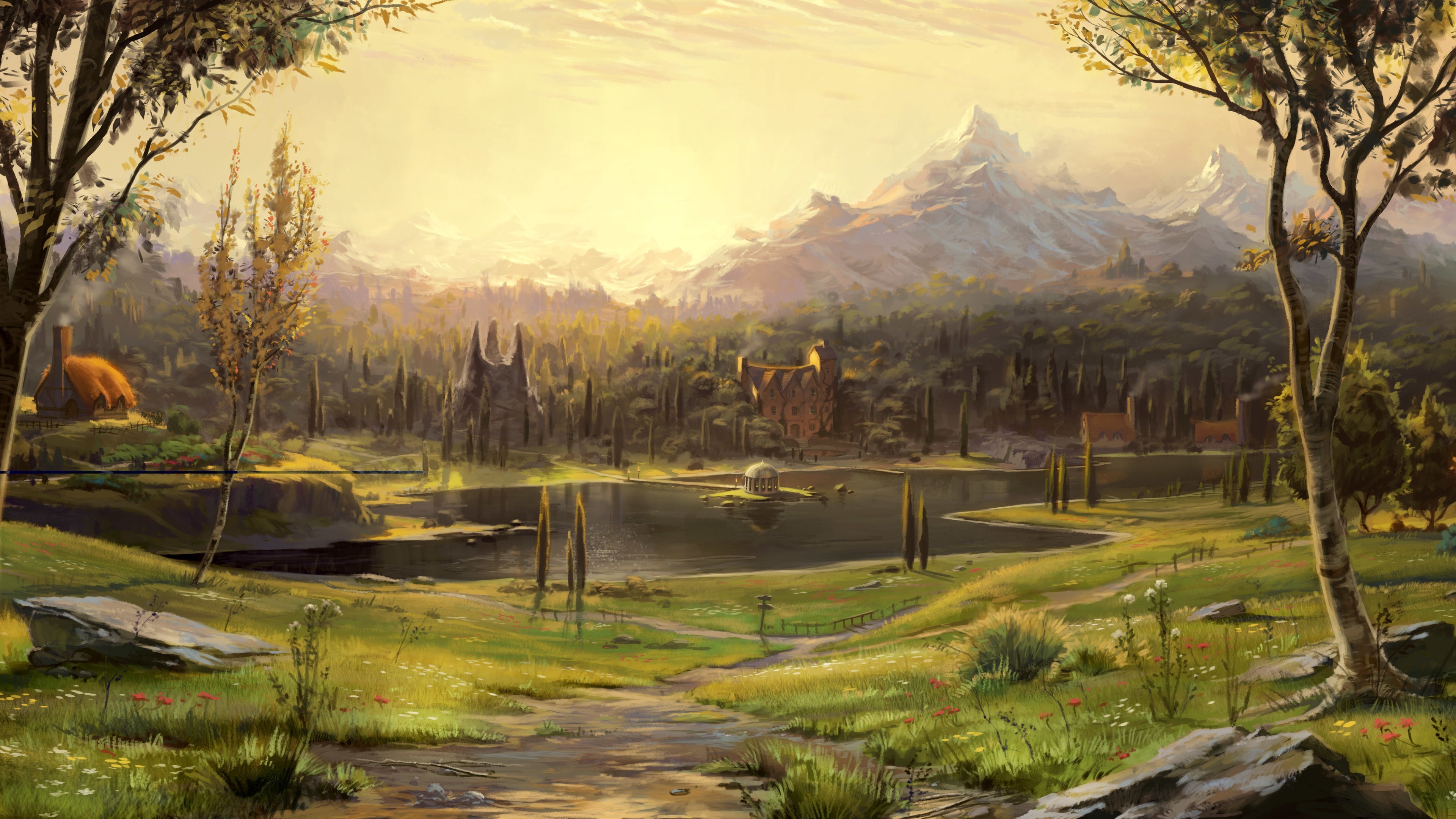 Description: A painting of a mountain lake surrounded by trees and grass with a mountain in the background and a forest with a lake in the foreground.