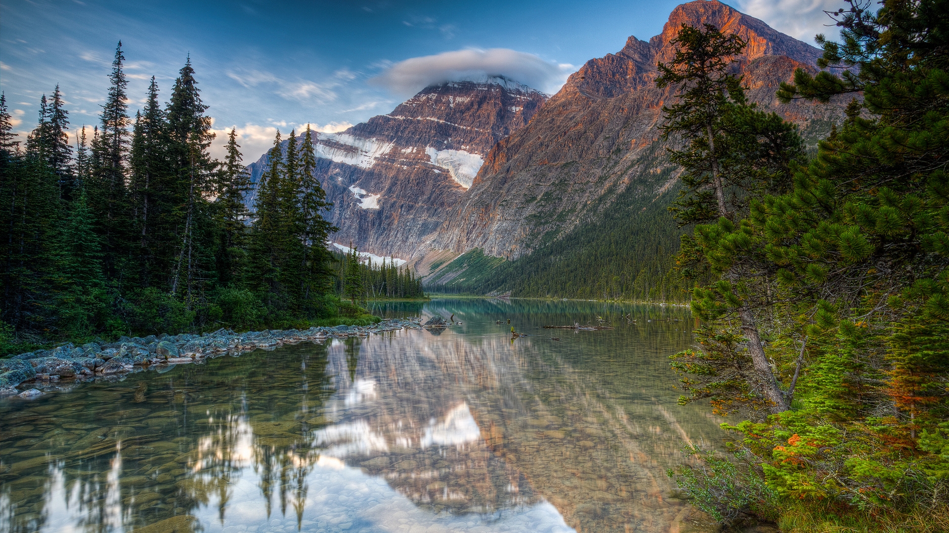 Description: A mountain range with a lake surrounded by trees and rocks in the foreground and a cloudy sky above.