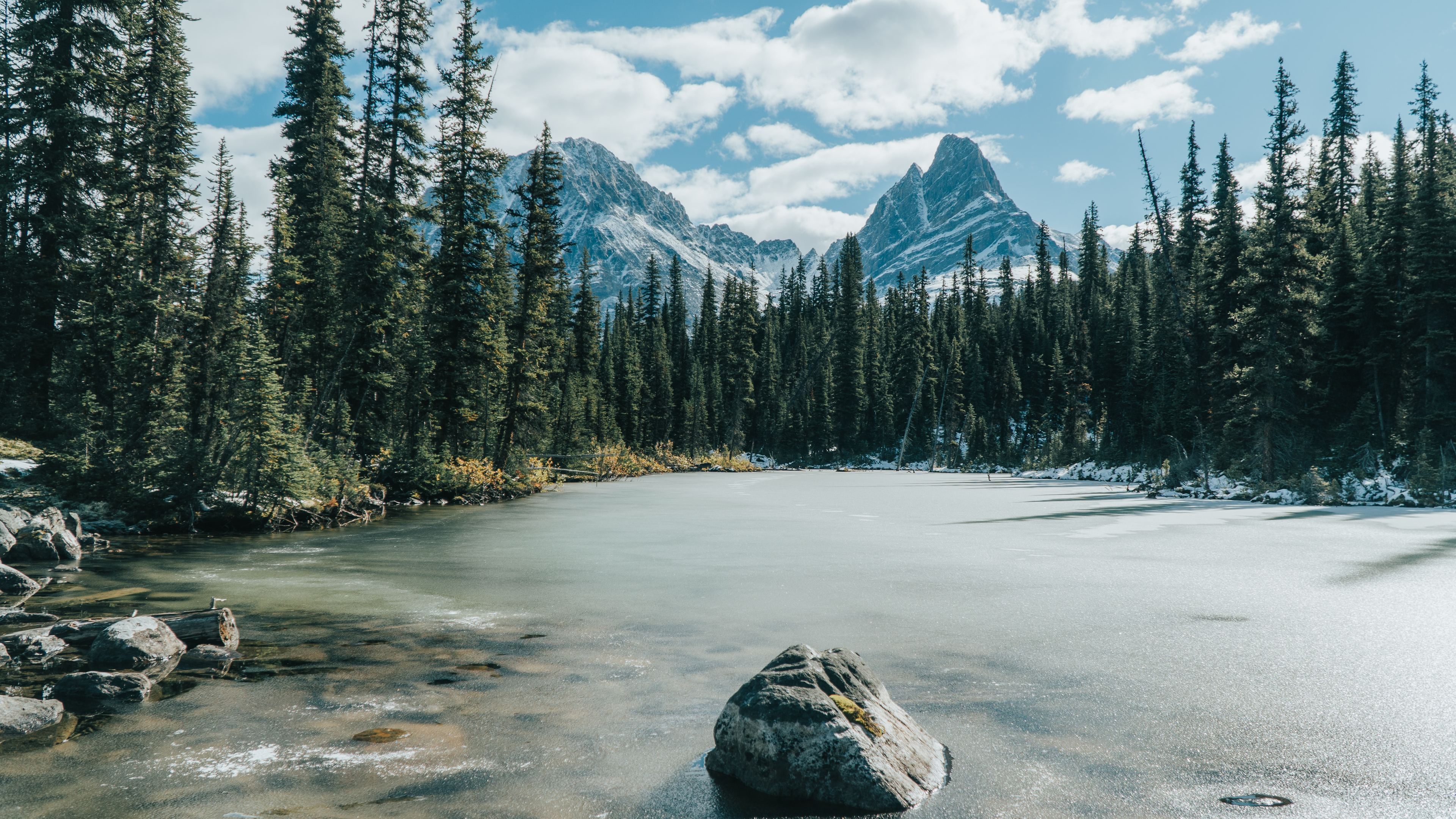 Description: A mountain lake surrounded by trees and rocks in the snow with a rock in the middle of the water.