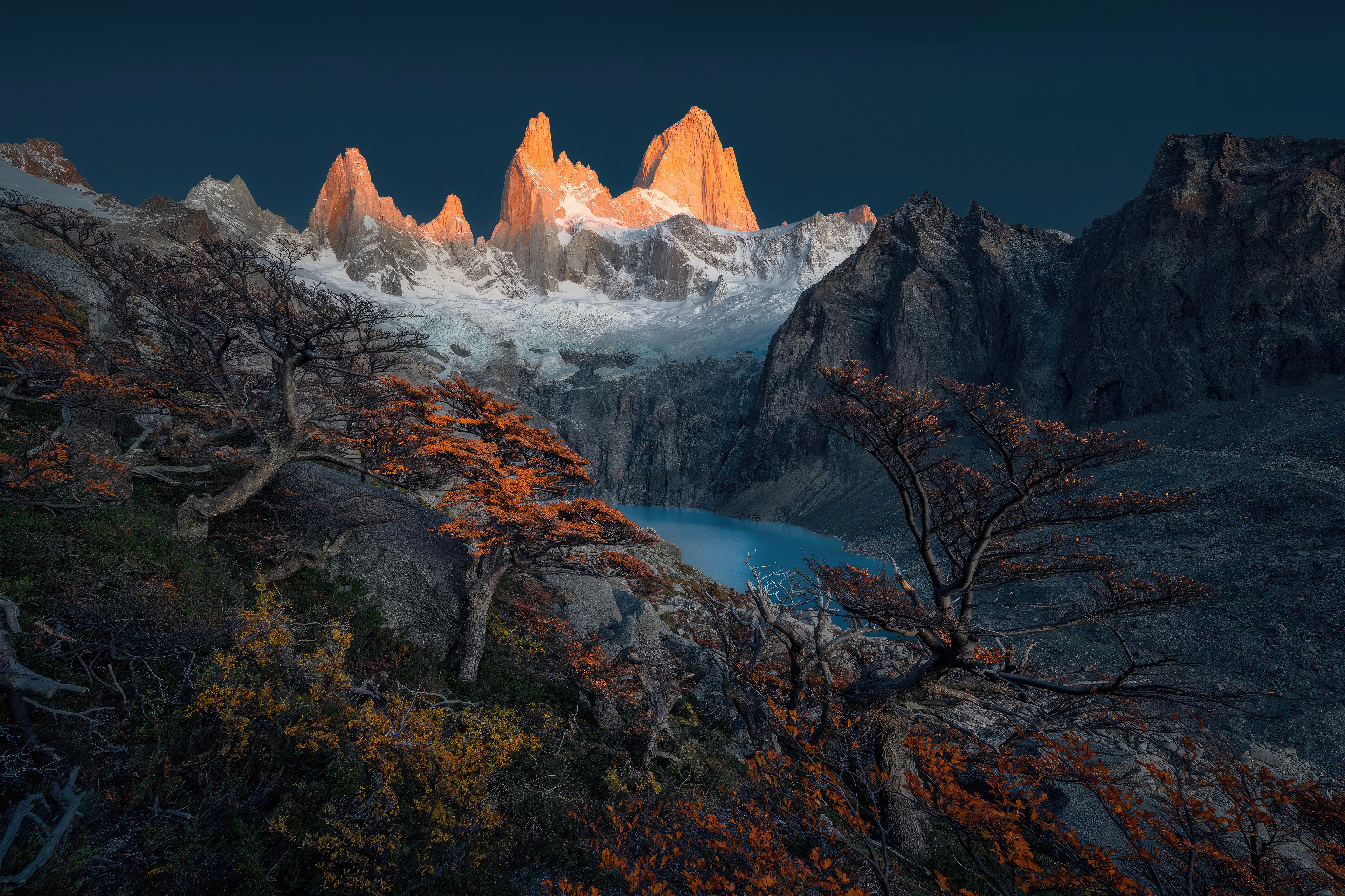 Description: A mountain range with a lake and trees in the foreground and a snow capped mountain in the background.