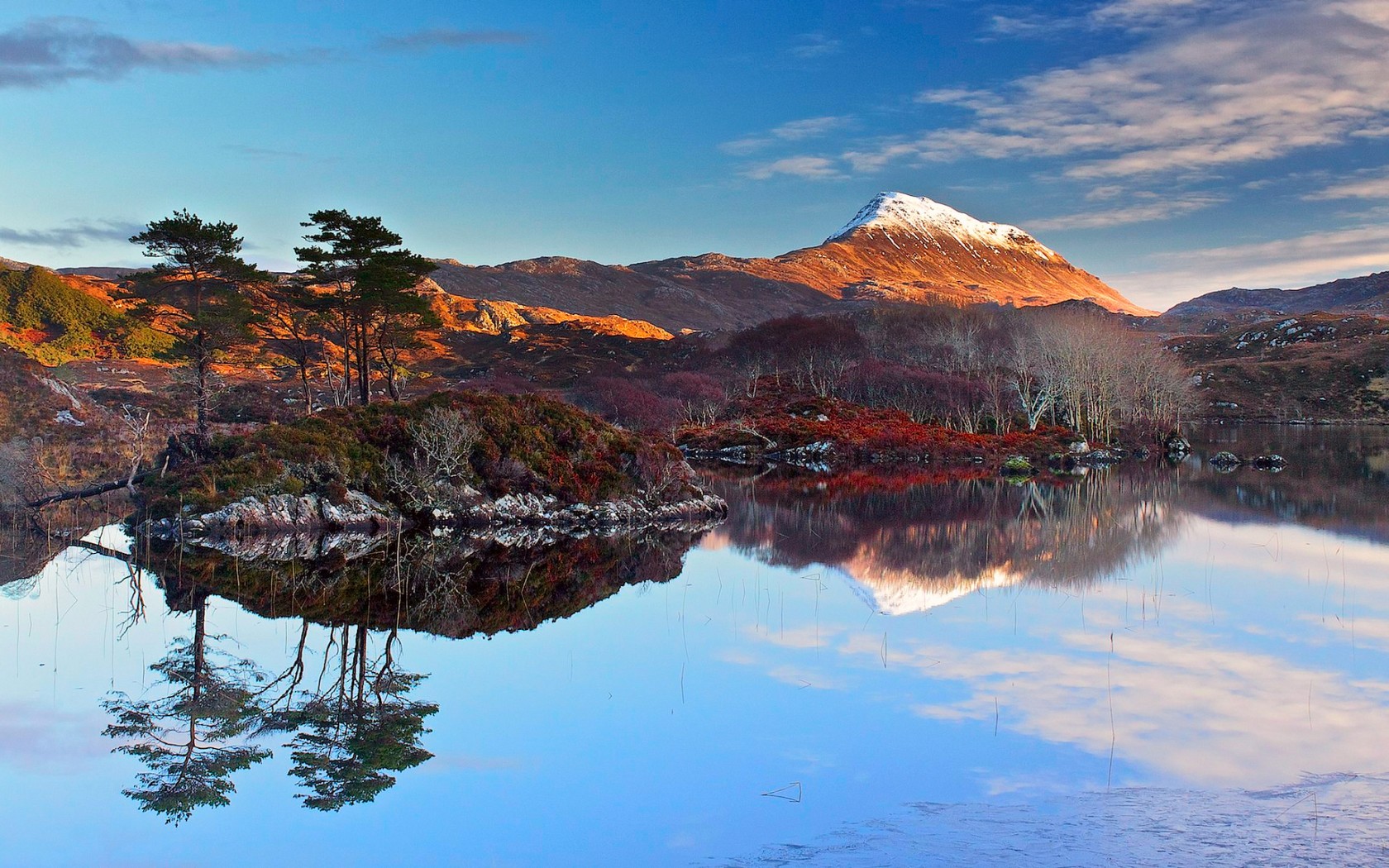 Description: A mountain range with a lake in the foreground and a snow covered mountain in the background with a few trees in the foreground.